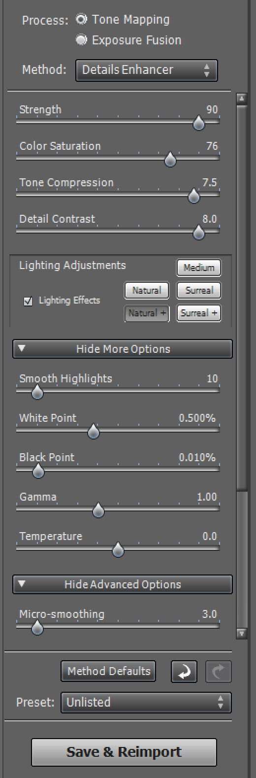I processed these photos using Ligthroom and Photomatix. First, I imported the RAW images into Lightroom and applied the lens correction filter. I then inspected the histogram data and selected the photos that I wanted to use to create an HDR merge. Lightroom has an HDR merge feature, but instead I exported to Photomatix as it provides a wider range of adjustments. This automatically opens the images in Photomatix and the first thing I do is determine if I want to apply any de-ghosting. There was a lot of movement from image-to-image in the trees and clouds, so I experimented with de-ghosting these parts of the image. Next, the images are aligned and merged and you can apply various presets and adjust for things like strength, tone compressions, color saturation, etc. See below.