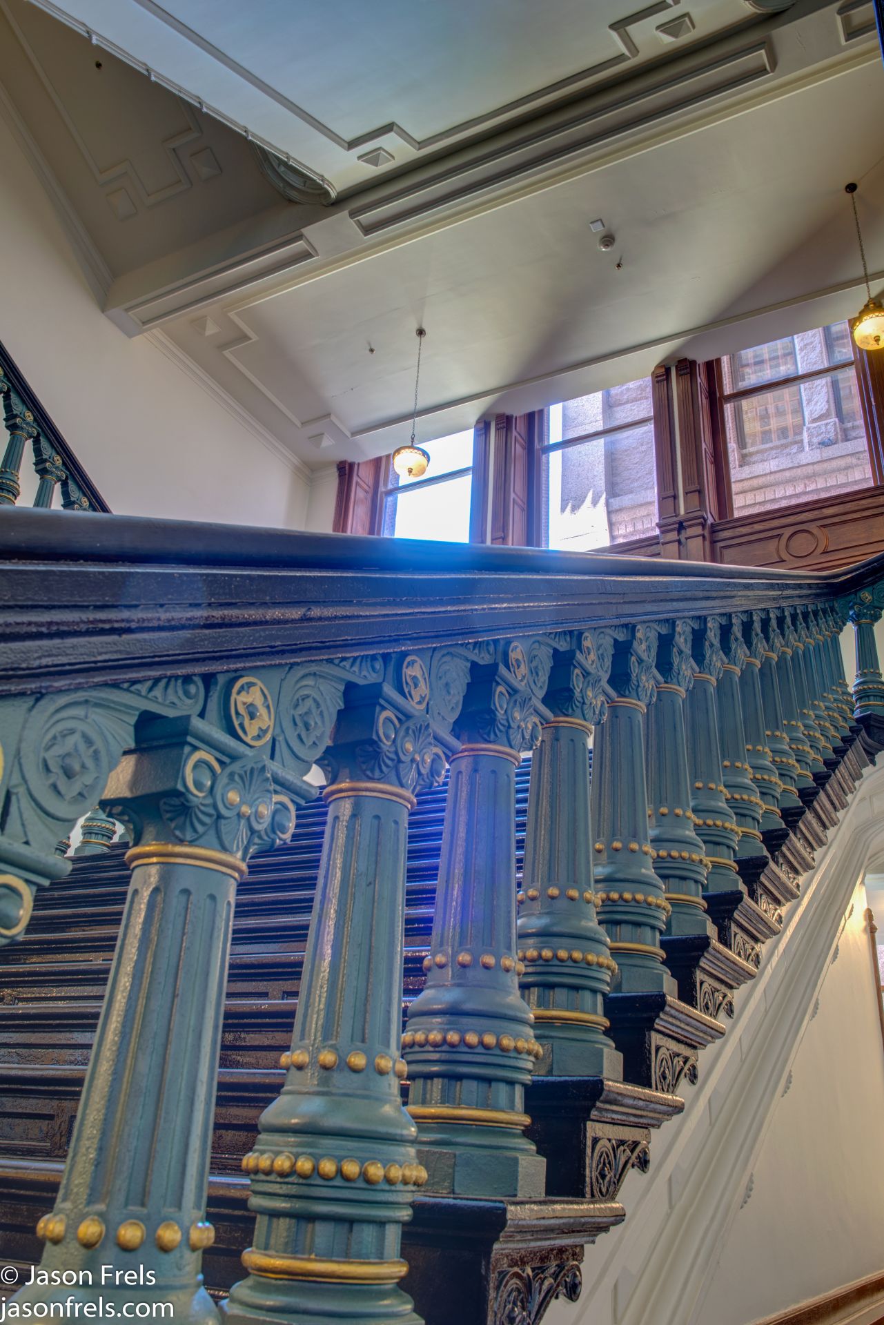 Ascending to the upper levels, you see the ornate stairs and banisters. See the image below: