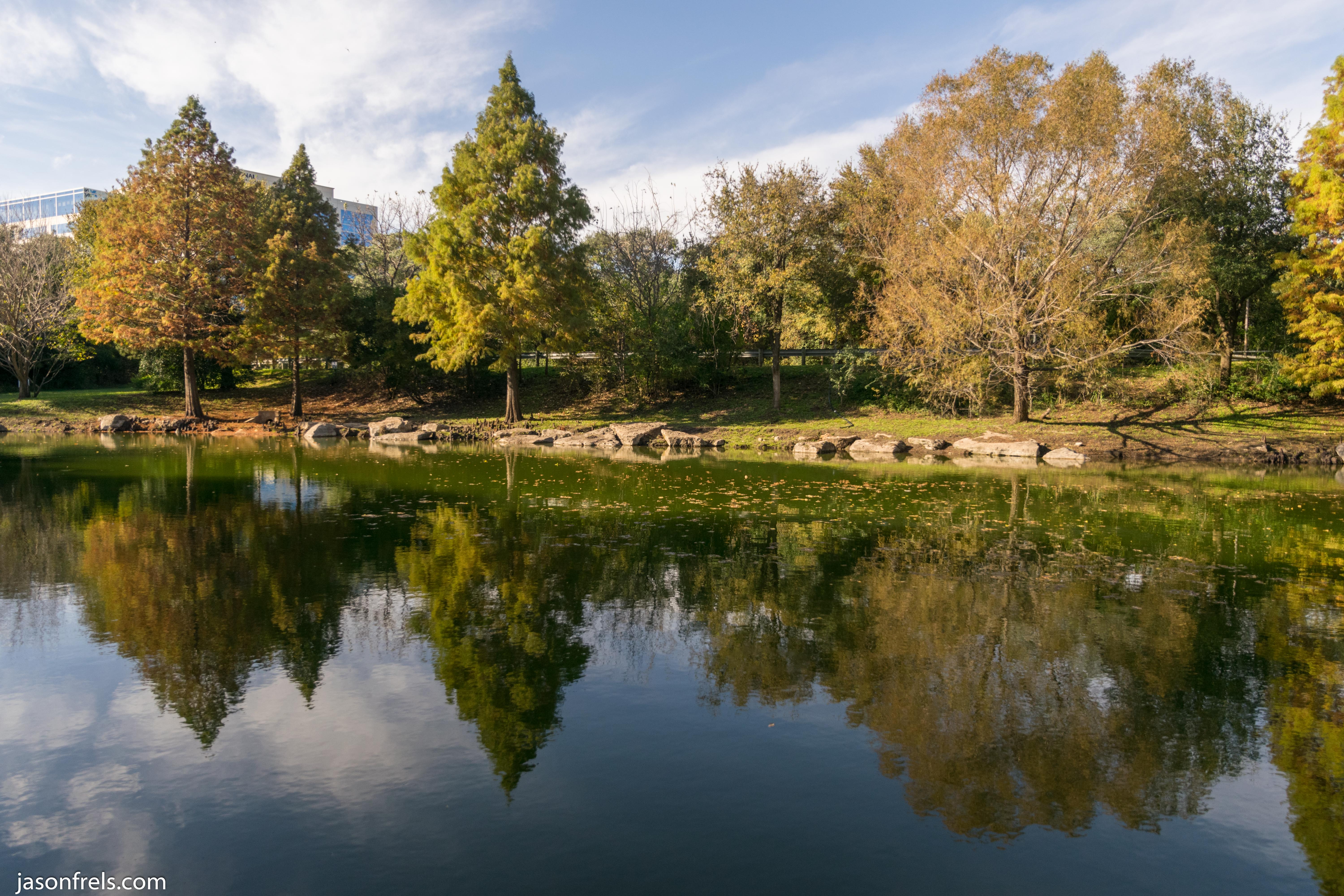 In Central Texas, we don’t really get much of a fall foliage season. Half the trees, like Live Oak and Juniper, don’t even lose their leaves in the Fall. But, I did manage to see a little bit of fall color near where I work in Austin. So, the next day I planned to bring my camera with me and walk around at lunch and see if I could find a decent photo. But, also the next day brought heavy cloud cover that lasted more than a week which robbed the scenery of warm sunlight.