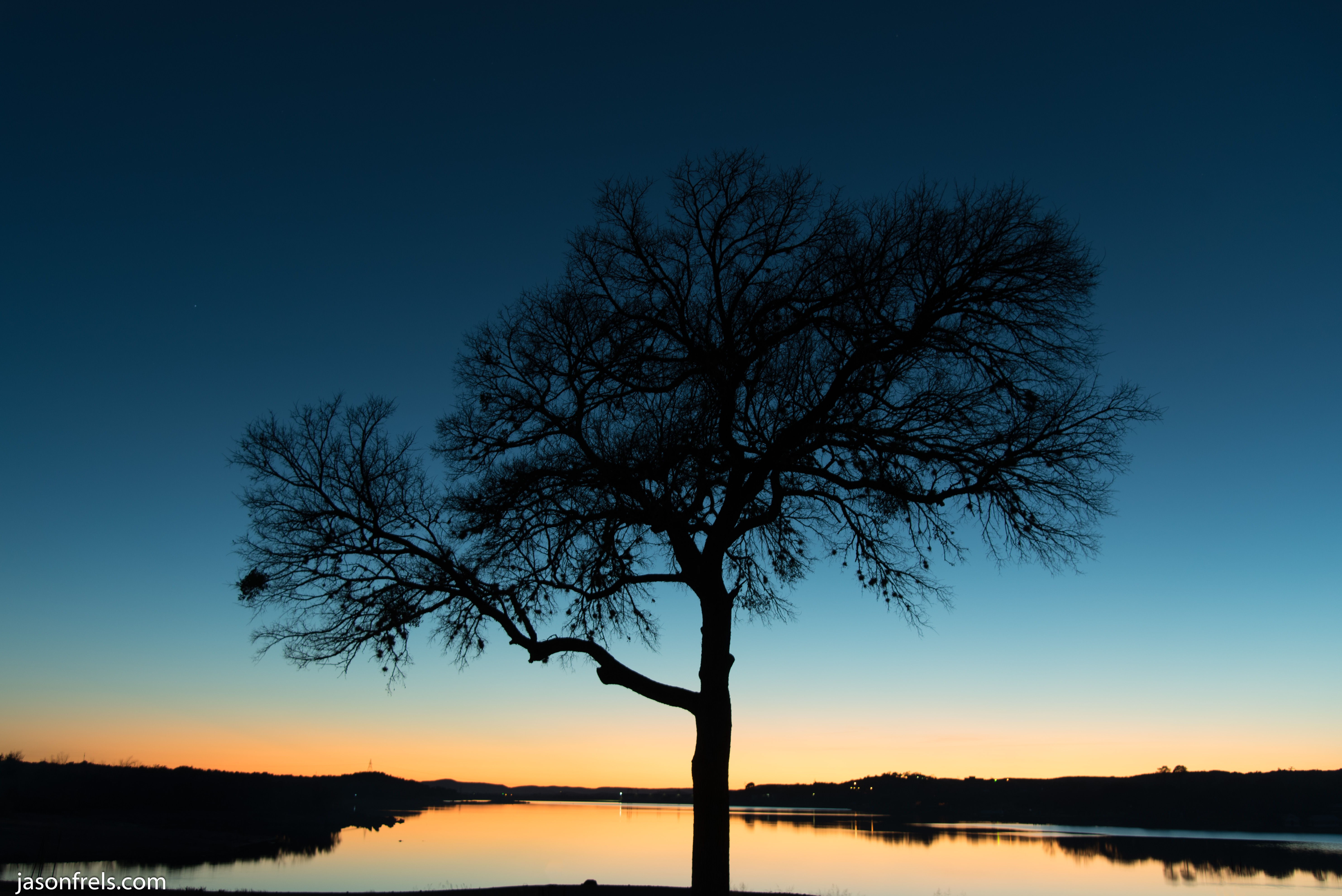 The sun set and I got deep into twilight and I got the idea of a single tree against the western horizon with the lake for reflections of the sky. It is winter and the tree has no leaves, so I thought that the silhouette of its complex bare branches against the horizon and lake would look great. Especially with the sky transitioning from dark cool blue to warm yellows and oranges. I had to get the camera down low and find just the right place as below the tree there is a muddy area that I didn’t want, and it is not far to the trees on either side of this one.
