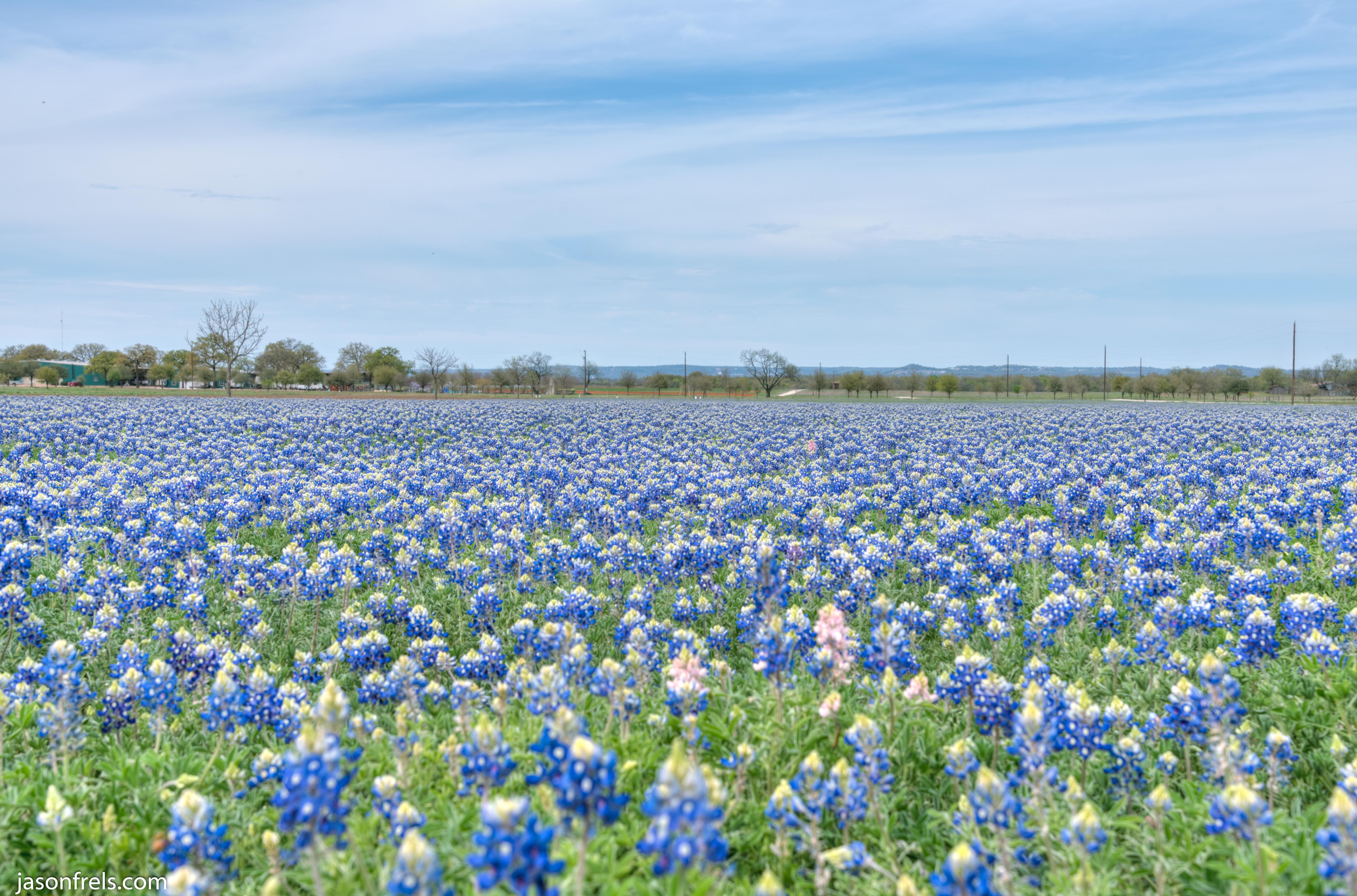 The first image below is a well exposed single photo with no clipping of highlights or shadows. In Ligthroom I brought the highlights down a bit and boosted the shadows. I also adjusted the hue of the blues slightly toward aqua to get what looked to me like a good representation of the color of the bluebonnets. They end up looking too purple in many photos that I see. The image does not have any clipped highlights and there is still some definition in the sky.