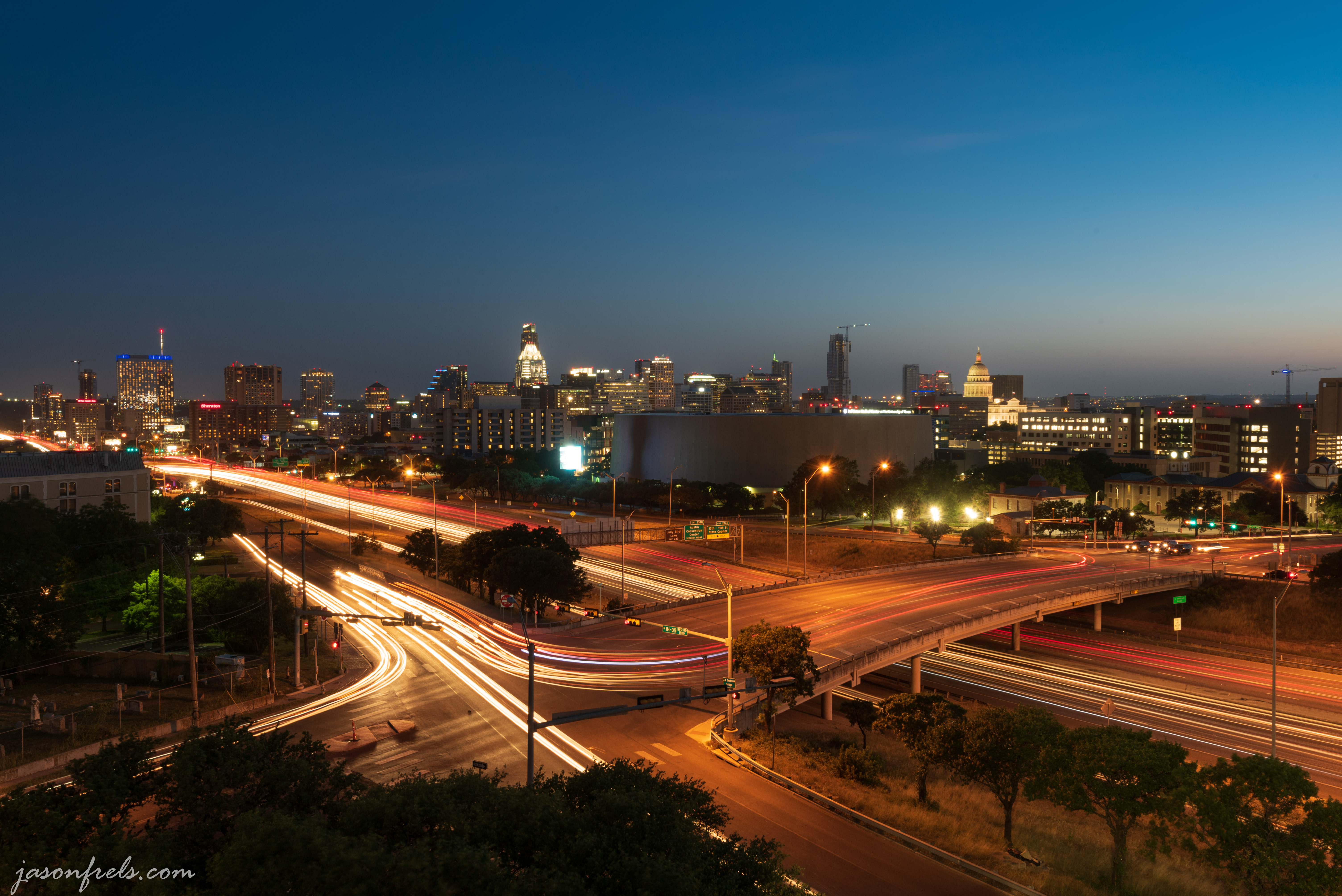 There is a perch I have been thinking about using to take sunset photos or long exposure light trails over Austin. It was a relatively clear evening and I wasn’t expecting much of a sunset show, but I thought that it might be a good night to get headlight and taillight trails along Interstate 35 during blue hour.