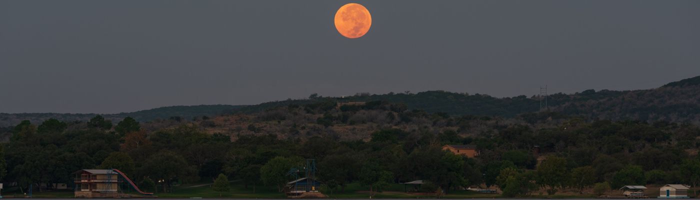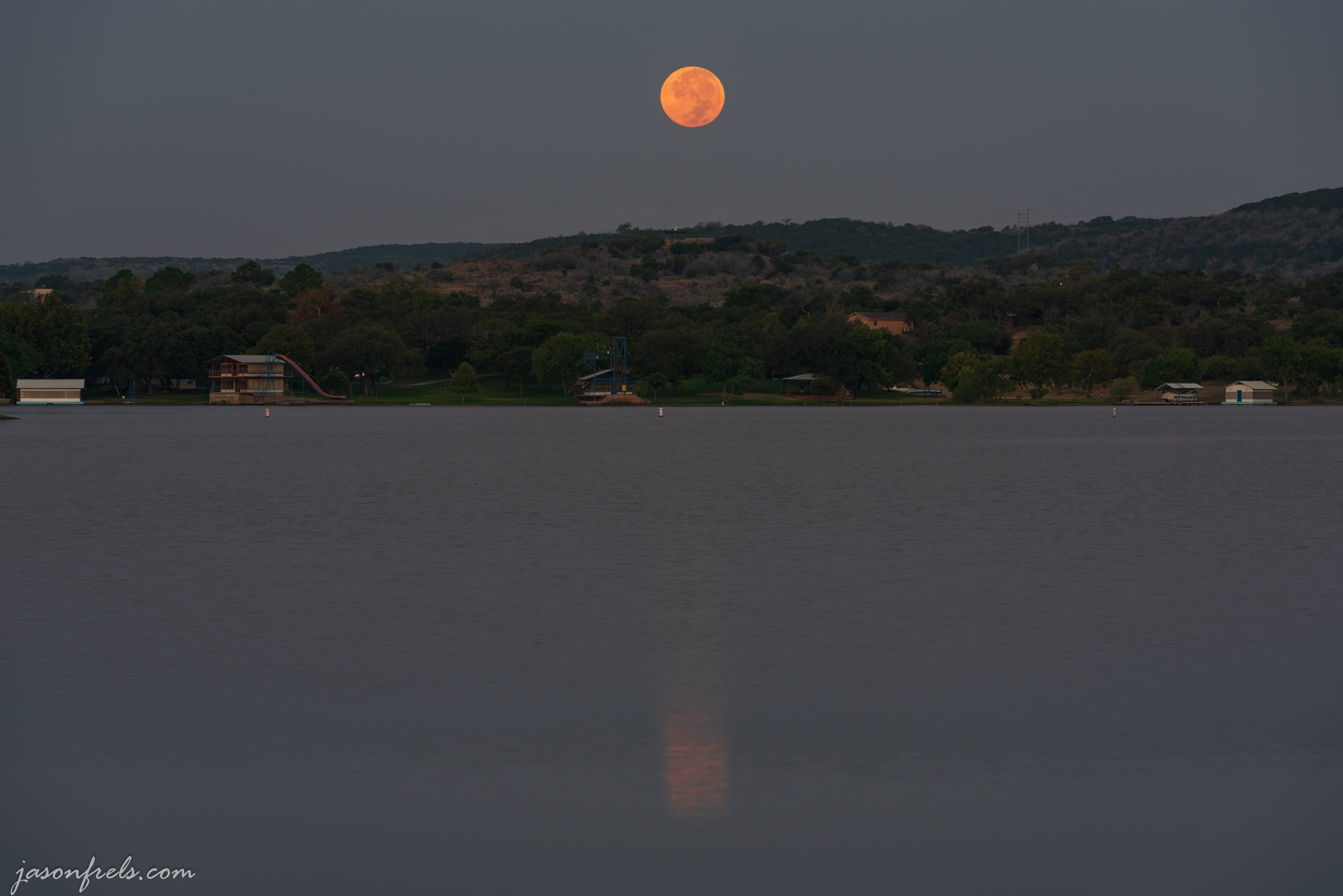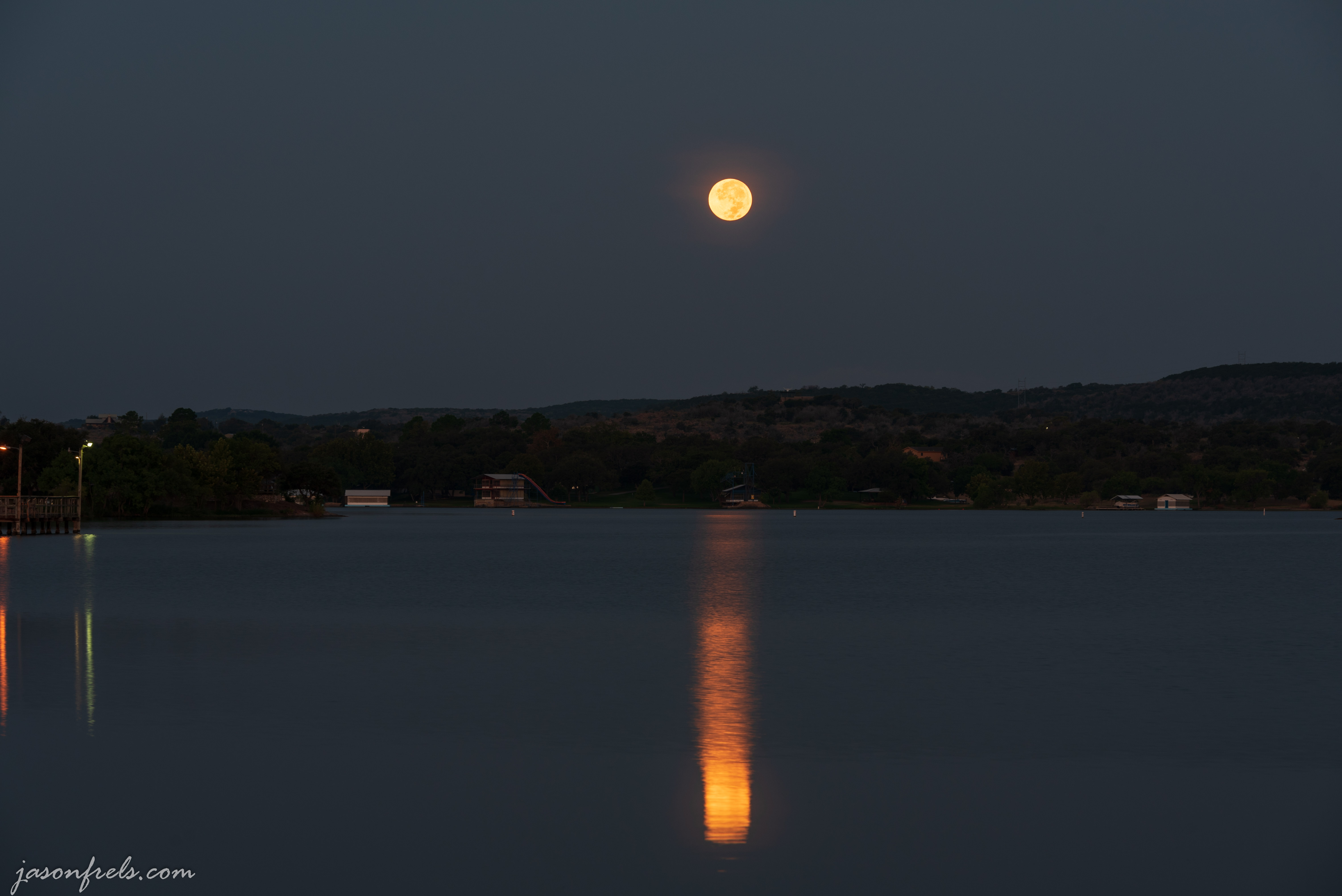 For some reason, I didn’t get the moon’s reflection stretched across the water like I wanted. Maybe it was the way the current was flowing or the wind direction, but I got some decent reflection. One nice thing about this shot is the two types of light down by the boat ramp. One is a sodium light which usually glows orange and this kind of matches the color of the moonlight through the atmosphere at this time. This kind of helped me sanity check the white balance a bit. Also, the horizon doesn’t look level, but if you observe that the moon and reflection are vertical, you can see that the photo is level.