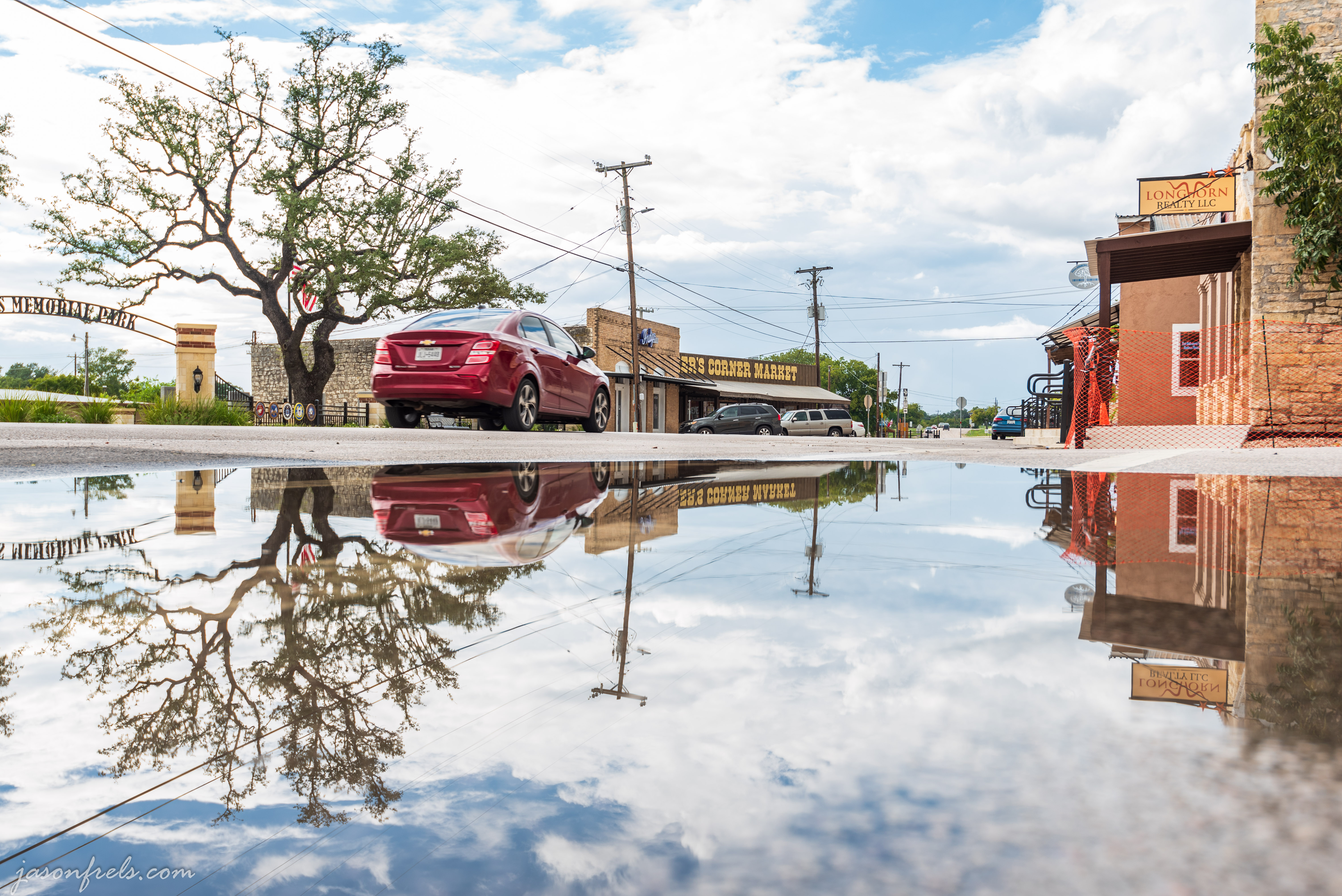 I also came across a large rain puddle that I tried to figure out what to do with; see the picture below. The power lines and their reflections really put some visual perspective in the picture. I waited until various cars had moved through the scene to provide a sense of motion. I like the way the red Chevy worked out just past the tree but not blocking the store in the distance. I really like the symmetry in this photo.