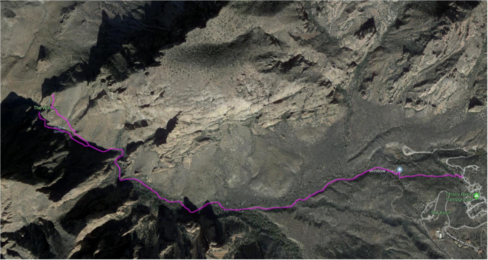 This trail leads down to a window in the rocks of a canyon, through which a stream flows and then over the edge of the cliff. From this vantage point, you can see the desert in the distance between the rocks. The window trail is also all downhill, so the return trip is all uphill (about 950 feet). So, it was good exercise for my legs which were a bit sore from the previous day’s hike. See the map below for the extent of my hike.