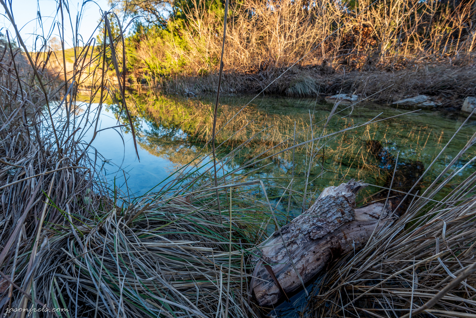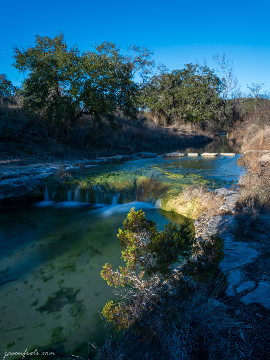 It was Sunday afternoon and I was itching to get back out and shoot some photos. I knew that there wouldn’t be a remarkable sunset as the sky was perfectly clear. I did think that I might be able to do something interesting with the little stream and waterfall at Balcones Canyonland National Wildlife Refuge, so I headed over there.