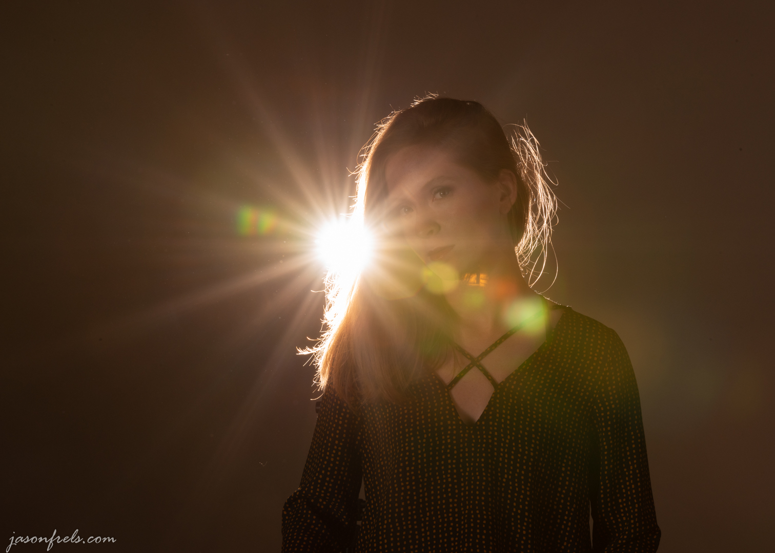 In some of these photos the lens flare was right over the model’s face, so I had to cull through a few images. I also had to move to get just the right amount of flash peaking around the model to get a good star flare. The light of the flash is mostly blown out in each image. I am not sure if I care for the extreme cool or warm white balance, but it is a technique that is there if you want it.