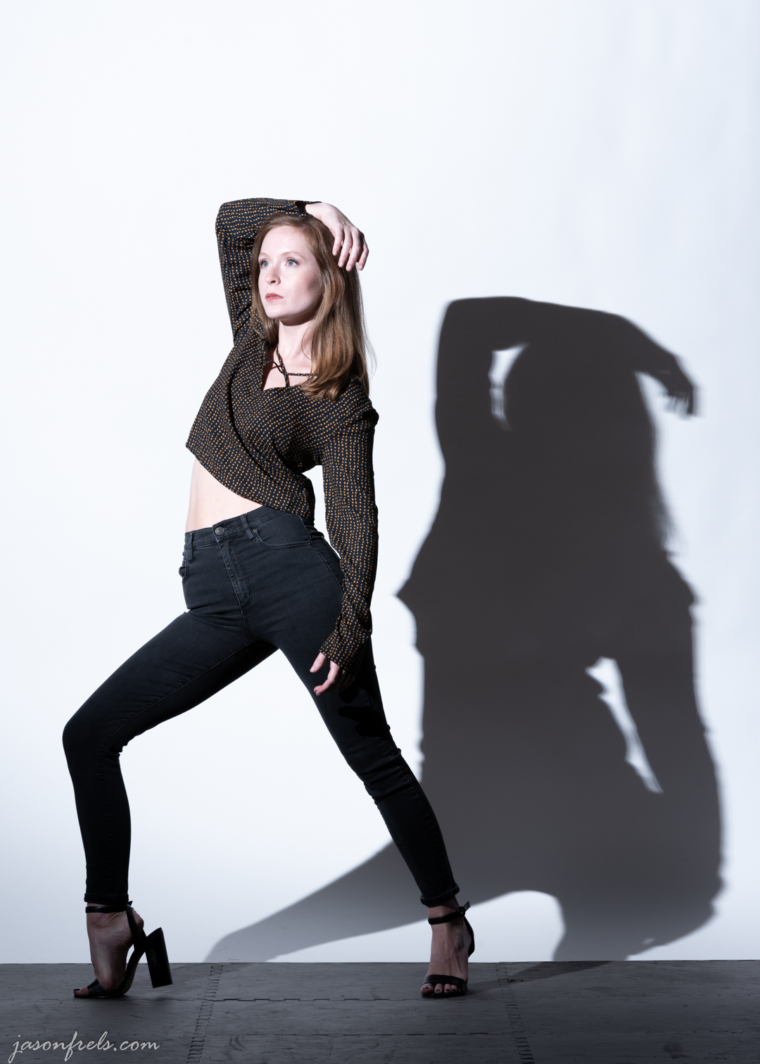 Next was a bright flash on the model against a close white background. This was to look like a Guess ad from the 1980s, though I must admit that I don’t really get the reference (and I’m from the eighties). The model is making dramatic poses with harsh side lighting so that she has a deep dramatic shadow behind her.