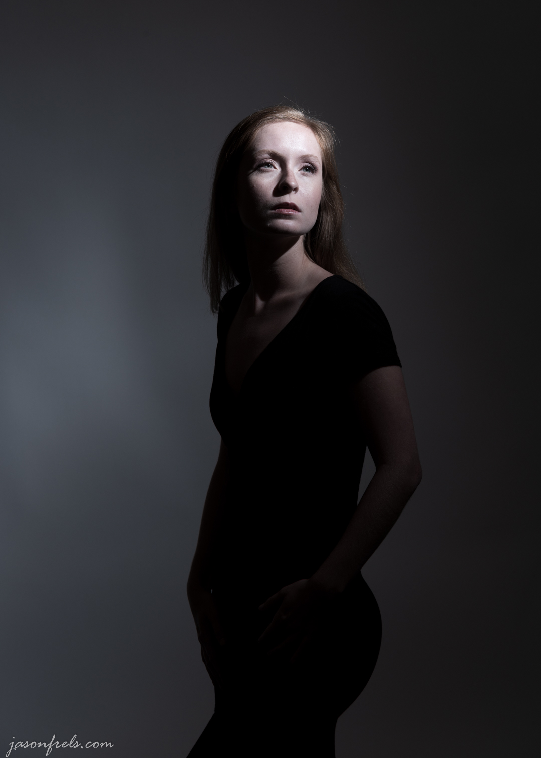 The next pose was similar in that it used one light source, but with more of the body and background in shot. Sort of a classic movie star pose, I think, with the model looking up into a single light source.