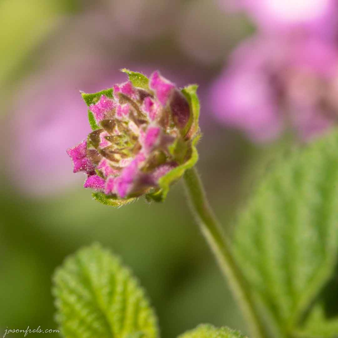 So, being of bored mind on a Sunday afternoon while waiting for the World Series, I decided to wander around the backyard and give this a try. I have some lantana that happily blooming in bright sunlight so I set up the tripod and camera to take some focus-stacked macros. Instead of a blooming flower, I decided the delicate little bud looked more interesting, so I focused on it from the side. After waiting for a lull in the breeze, I took 6 photos of the bud at varying focus points to merge in Photoshop. Below are the two extremes of the group, far-focus and near-focus.