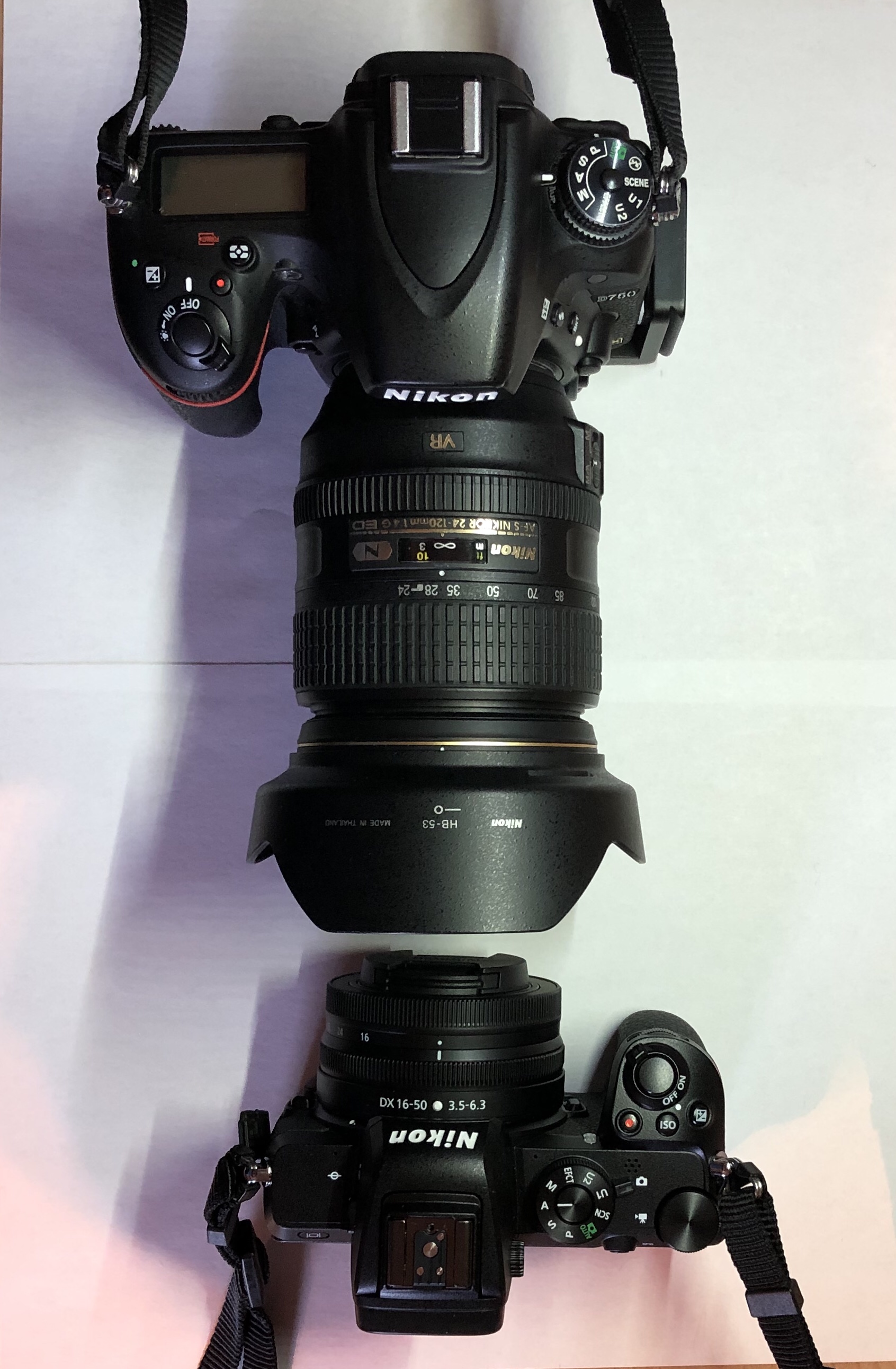 The camera that I settled upon in the Nikon Z50. This is a relatively new camera from Nikon and it is amazingly small and light-weight compared to its capabilities. It fits into a small pouch or even a pocket and will be nice for casual hikes. The image below shows the D750 full-frame DSLR on the left and the Z50 on the right. You can see that the D750 and 24-120mm kit lens dwarfs the Z50 and 16-50mm kit lens. Note that the D750 has a tripod bracket on it that makes it a little bit bulkier.
