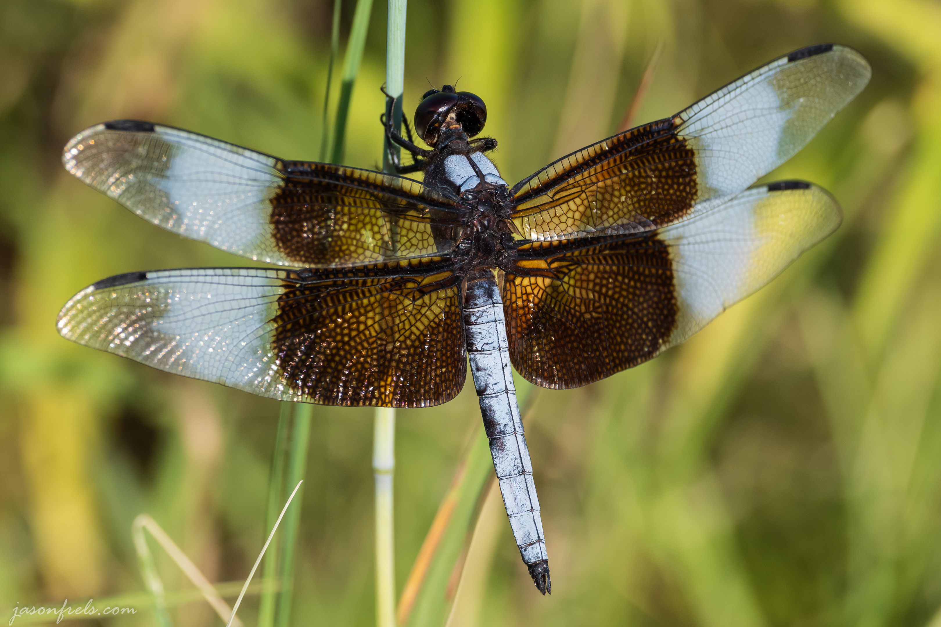 He let me take all the photos of him that I wanted. I usually see these white striped dragonflies on the ground where they kind of get lost in the ground clutter. It was nice that this guy perched on a blade of grass so I could blur a bit of the background.