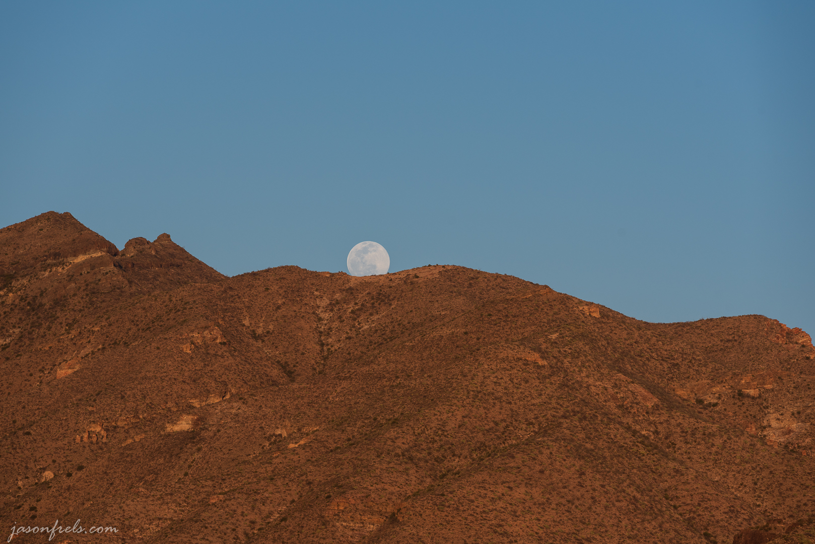 Saturday evening I planned to take sunset photos at Sotol Vista in Big Bend Naitonal Park. Sotol Vista is a high overlook just off the scenic Castolon Road and there is a clear view west over the desert. As I arrived at the vista, my daughter noticed that the moon was just making it up over the mountains so I quickly grabbed my long lens and took a few shots.