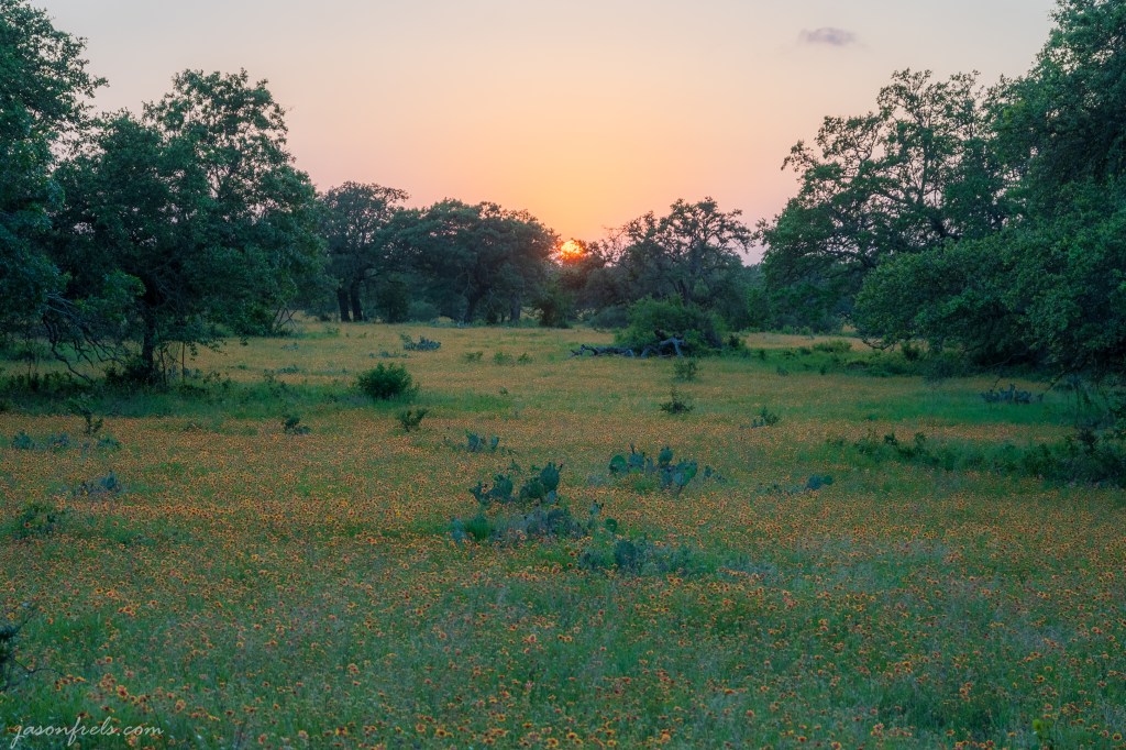 There is a pasture along a highway that I pass sometimes. This pasture is full of wildflowers right now and I have stopped to photograph it more than once, but I don’t think I have gotten it right. Below is the pasture with the sun setting in the distance.