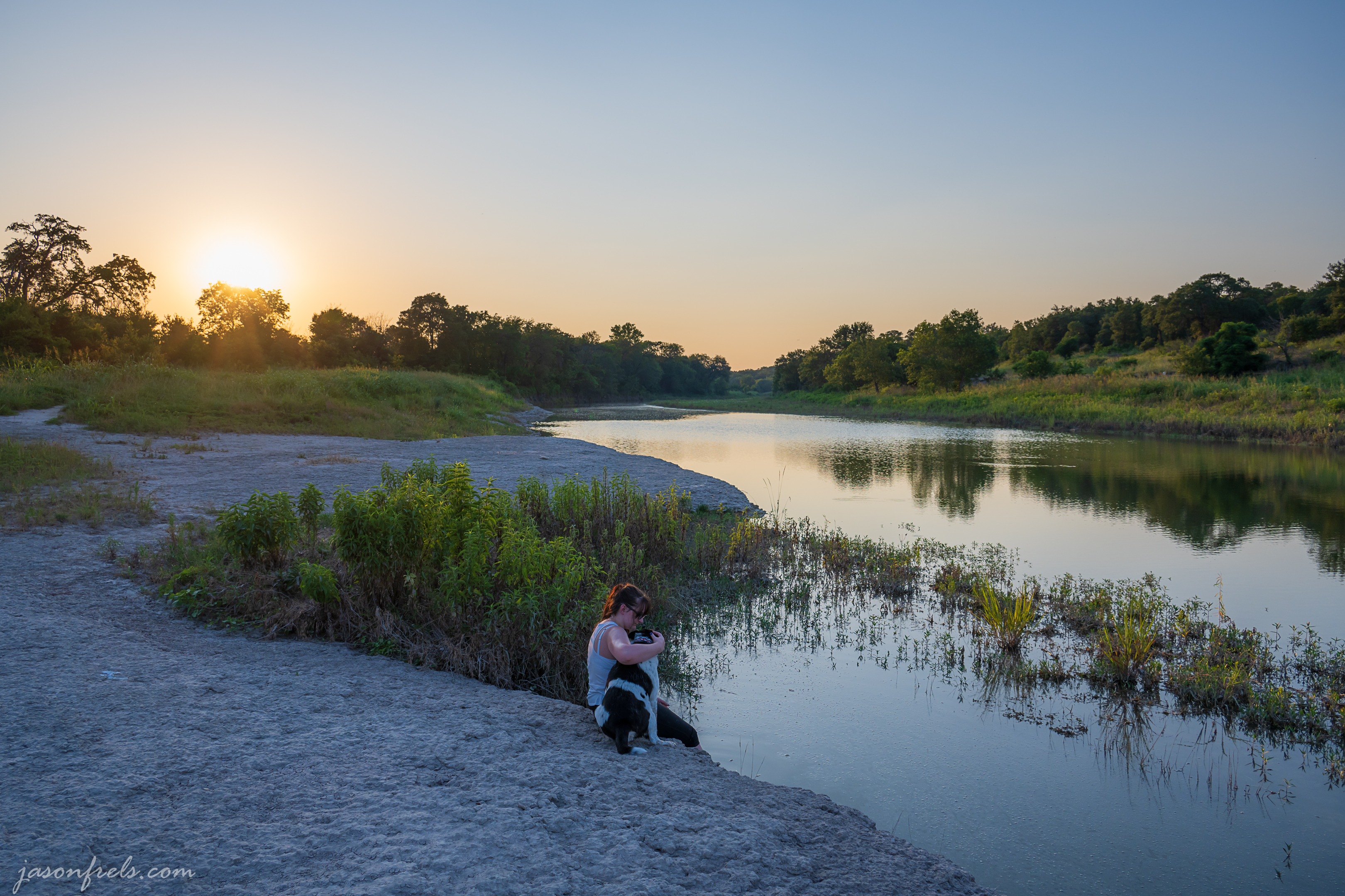 We got a lot of spring rain and the river is temporarily full of water. I went down there hiking with my daughter and her dog and she wanted me to shoot some photos of her with the dog. As she sat on the river bank with her dog, I liked the way the sun lit up her hair from the back so I shot pictures of her almost directly in to the setting sun. Ordinarily, this is a terrible way to shoot a photo of someone as the sun dominates the photo and makes their face look dark, but with the shadow and highlights sliders at their extremes in Lightroom, I think that this photo turned out pretty good.