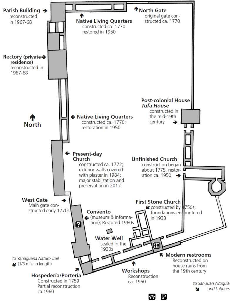 An initial small chapel with a straw roof was built. This church no longer remains, but its foundation has been found. The mission also had housing for the Indians, a workshop, granary, and a farm and the outlines of these structures remain.