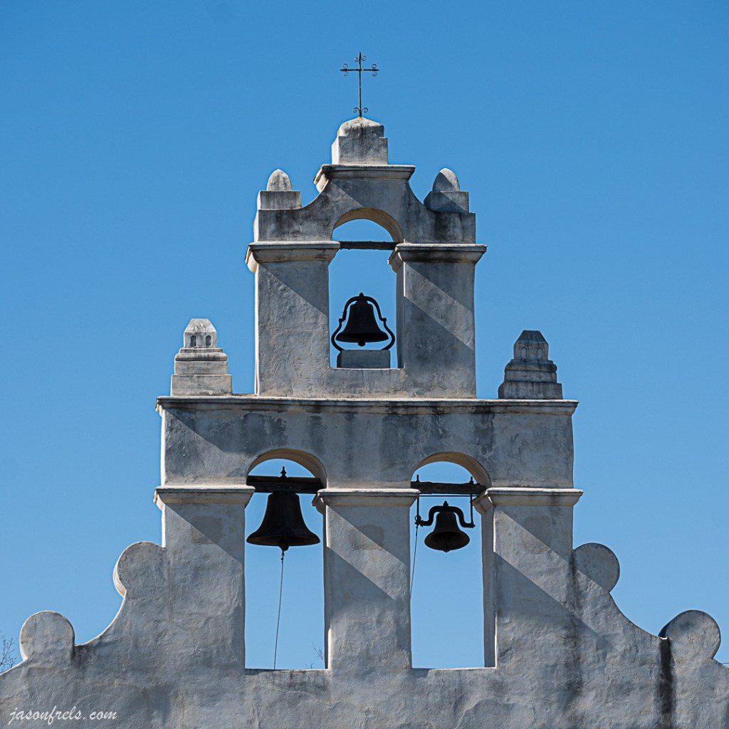 Photographically, I tried to take some photos from interesting vantage points and details. One thing that I found interesting in the missions, was the front façade and bell towers. Like Mission Espada, the church of Mission San Juan was built with an espadaña that could accommodate three bells, though I think it took quite some time to get its third bell as I saw many old photos with only the two lower bells. Looking at the bells it does seem obvious that they weren’t all ordered from the same catalogue.