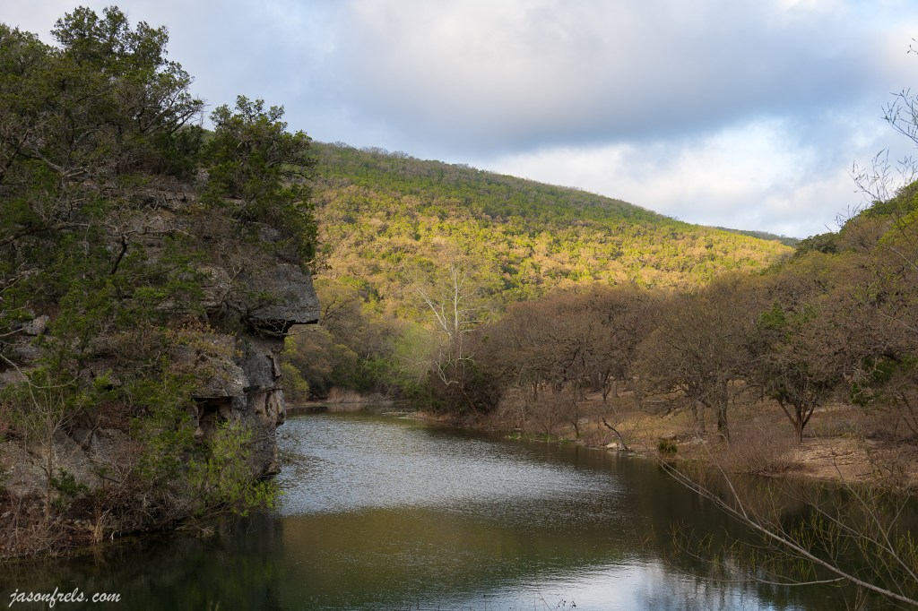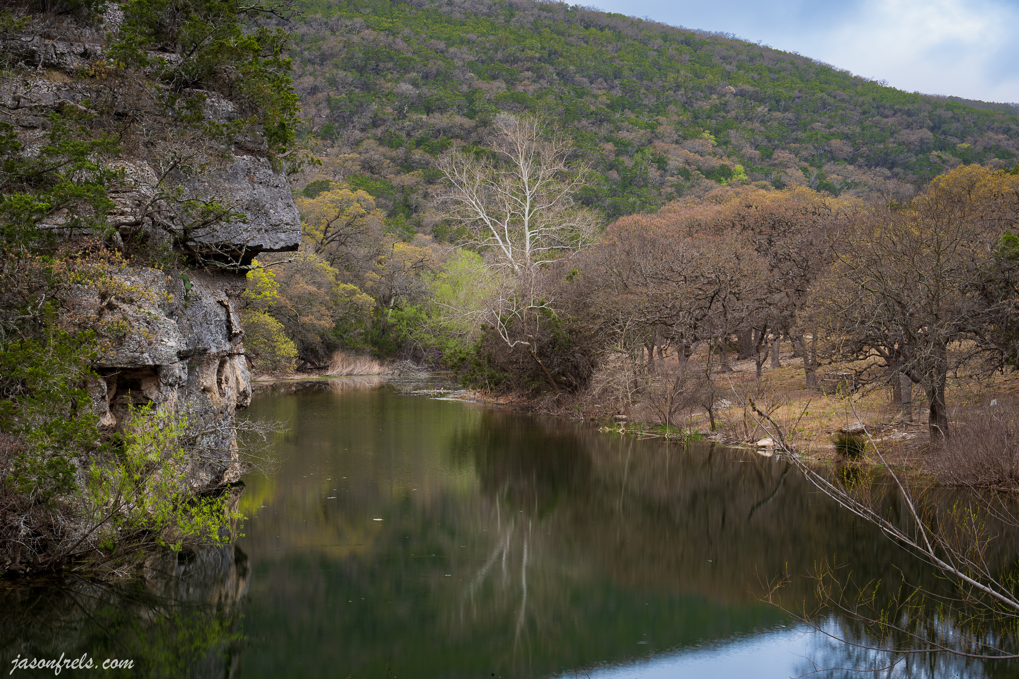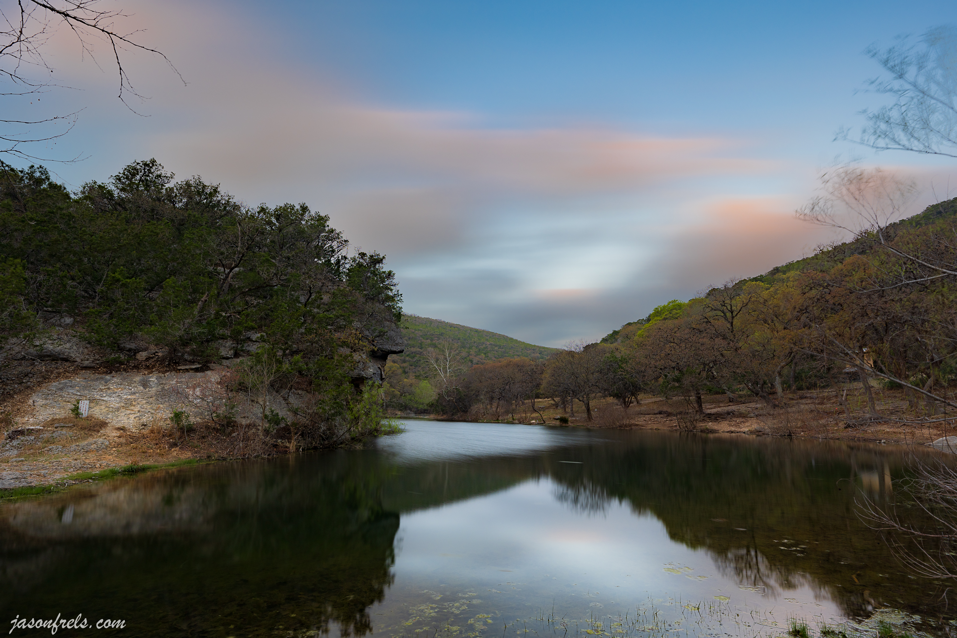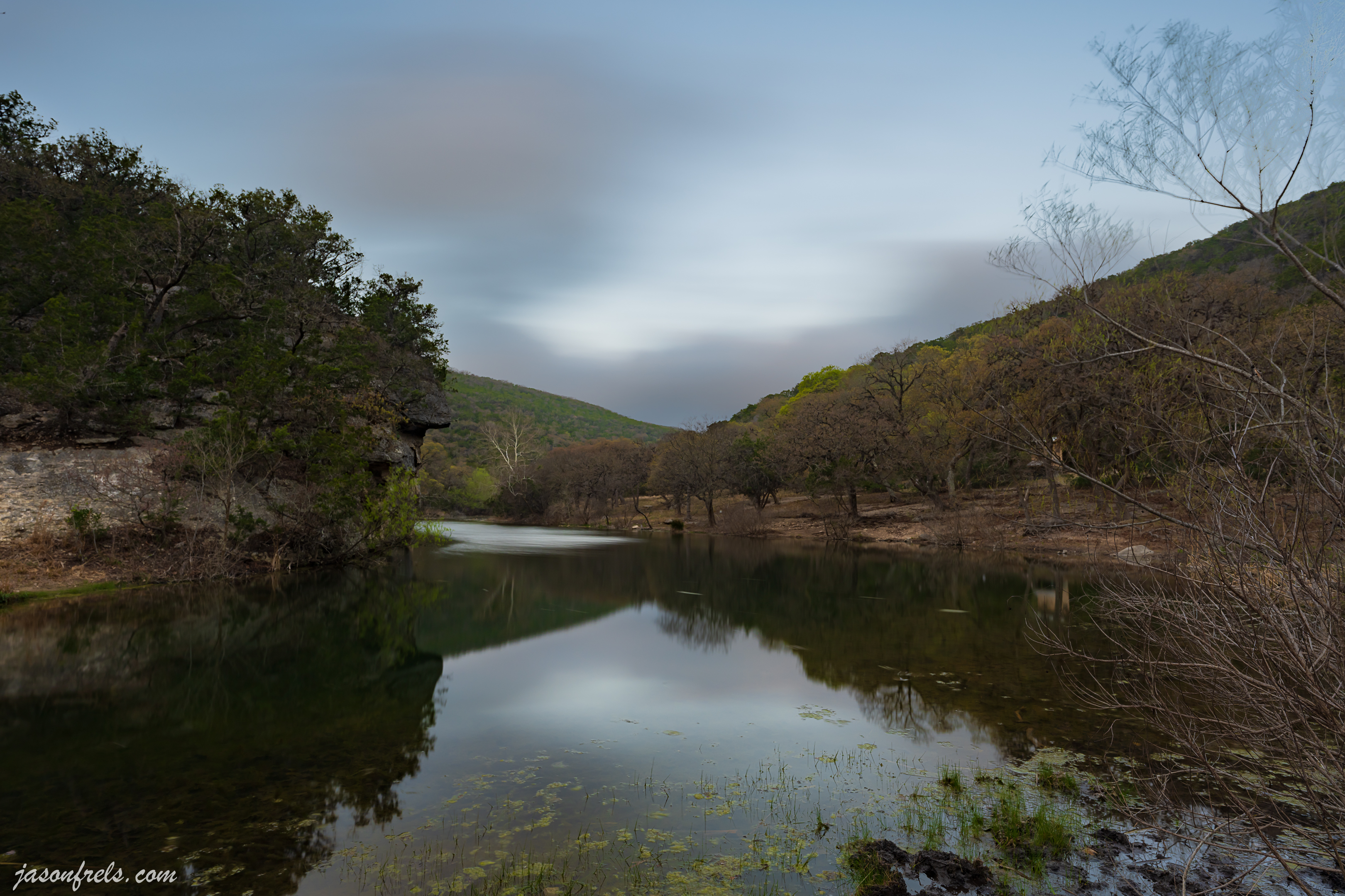 After shooting the stars, I planned on hiking in the dark to a pond to see about some photos just after dawn. From the top of the ridge on the previous afternoon I could see that the pond was full and thought that it might be scenic with the early morning sunlight on the distant hillside. The pond is a day-use area I and I figured that I would have the place all to myself at dawn and I was right. I didn’t see another person, only some animal eyes reflecting my head lamp in the dark; probably a wild hog judging by the way it moved.
