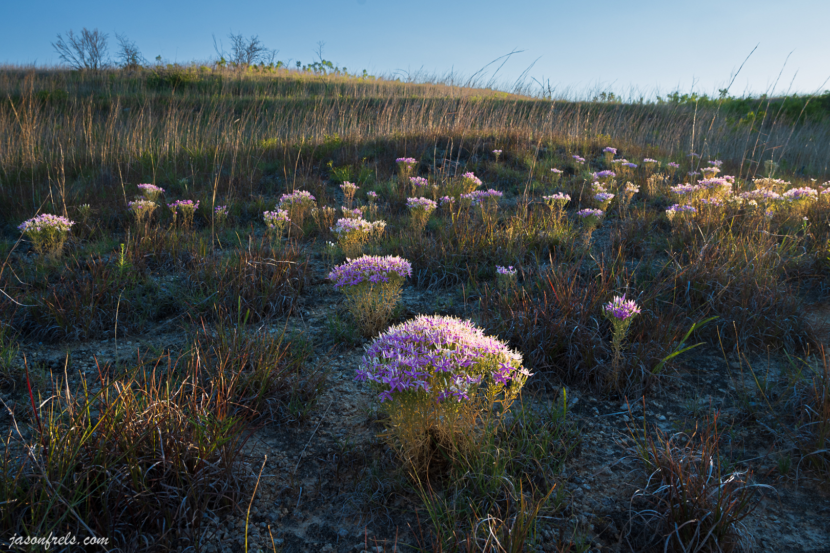 The below photo is my best result. I waited until the sun was just on the horizon and was only hitting the flower tops and not the rocky ground beneath. I also have to get the camera at the right elevation so that you could see the flowers behind the main bunch. And I had to be able to shoot without the sun washing out my photo. I still had to do a lot of work to knock down the rocks in Lightroom. What do you think?