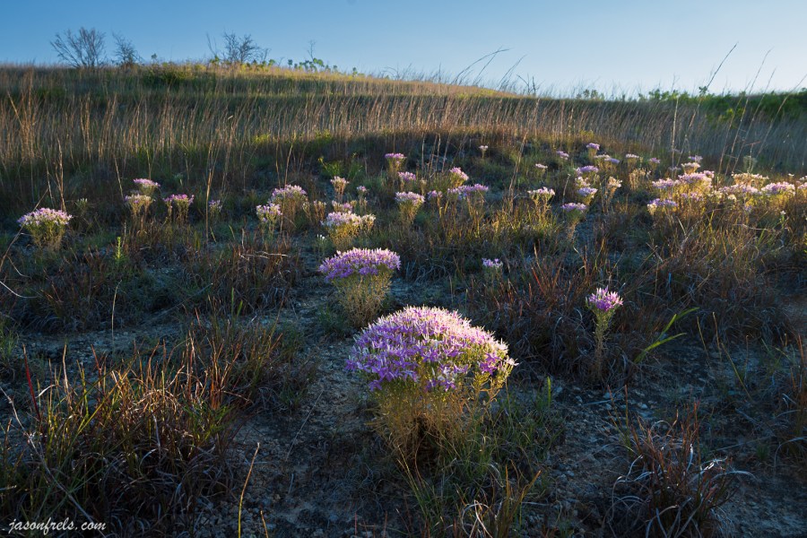 The grass at the wildlife refuge is long and golden and would sway if there was a breeze. I have walked around trying to figure out what to do with the long grass and have nothing to report. There are still a few wildflowers out and there is a patch of pink wildflowers that I have been working on one of the trails in the back of the Doeskin Ranch unit of Balcones Canyonlands National Wildlife Refuge. I have come back to these pink wildflowers several days now, tried to figure out how to shoot them, gone home and looked at my photos with disappointment, and returned to try again. The wildflowers kind of mound, and my idea is a mound of flowers in focus with other mounds fading off into the distance. The main problem I have is that they are growing on very rocky ground and the rocks expose as brightly as the flowers and ruin the effect.