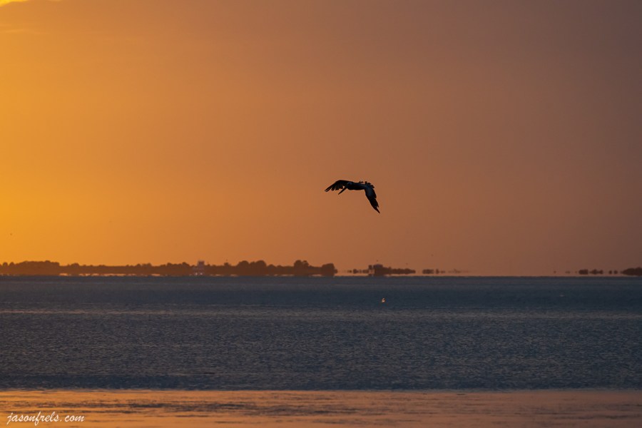The sun did manage to get underneath the clouds for a few minutes as it reached the horizon and I had the opportunity to shoot some silhouettes against the yellow sky with the blue water below for contrast. Below is a pelican that was flying along the bay looking for dinner. I have a few other bird silhouettes, but I like the pelican the best.