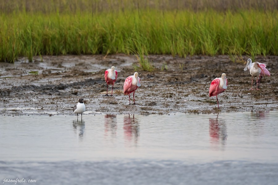 I wandered around and tried to take some wildlife photos when in Galveston one evening. I thought the sunset might be nice, so I headed down to the bay side of the island to see what was there. In the muddy flats along the bay were a bunch of Roseate Spoonbills, so I crept over and shot photos of them. They looked at me, but otherwise didn’t seem to care that I was there.