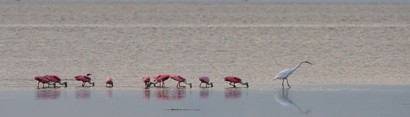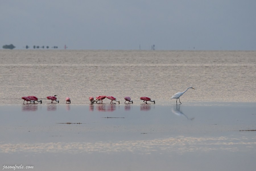 The bay is very shallow and I see people wade far out in it to go fishing and they are only knee deep. In the image below you can see the spoonbills following an egret around out in the bay looking for food. They were on the edge of a very shallow area which gave them a nice reflection in the still water. But you can see that the evening is fading to gray so I didn’t have high hopes for sunset clouds.