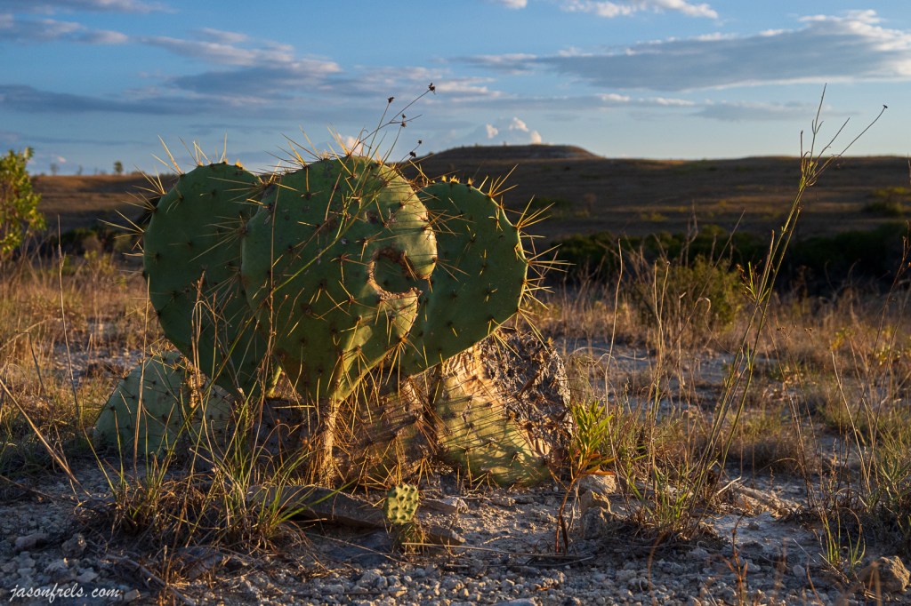 The photo below was the inspiration for this post. It might have been a better photo if I had gotten down there and pulled the weeds around the prickly pear to simplify the composition. I really wanted the prickly pear to stand alone in the golden sunlight against the distant hillside and I considered for a moment clearing out the weeds. But this is at a wildlife refuge and nature preserve and I felt not only that I shouldn’t disturb the plants that much, but also that I should portray the landscape as it is. So, I have prickly pear and weeds in evening sunlight.