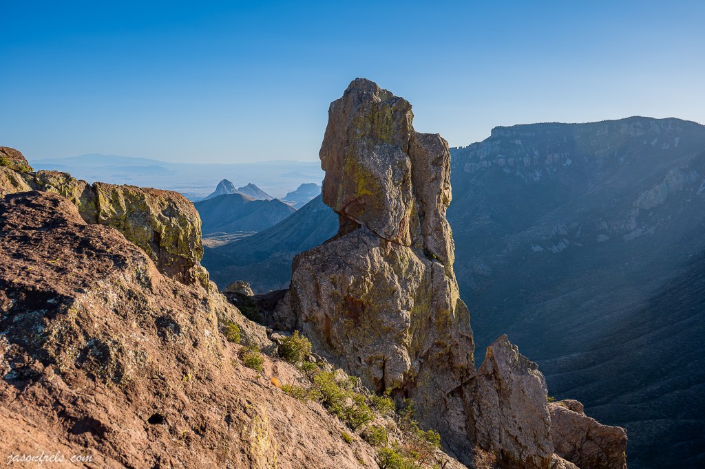 Once I reached the cool and windy top of the trail, it was difficult to decide where to look with beautiful mountain and desert views in all directions. I had to wander around for a while and take it in before deciding on some photos to take. I did really like a large, jagged column of rock to the south of the peak. It was lit well by the late afternoon sun and you could see the mountains and deserts into Mexico in the distance.