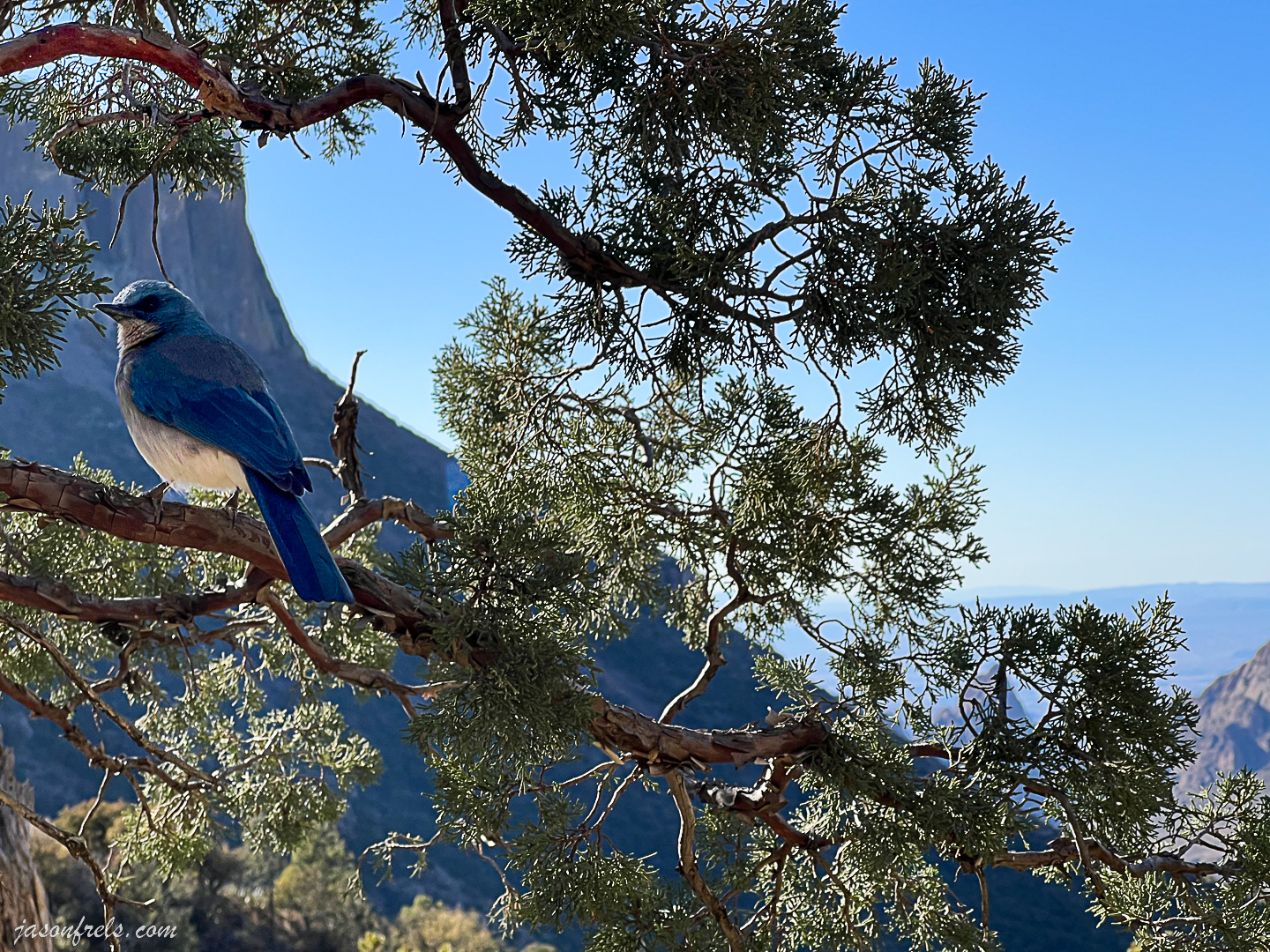 The trail was constructed by the Civilian Conservation Corps as the National Park was being established in the late 1930s and early 1940s. The trail is named for Lost Mine Peak, but apparently there was never a mine in this area lost or otherwise, so don’t expect to find a secret horde of gold or silver. The paths are well constructed and easy to follow with several benches for resting along the way. You can expect to gain about 1000 feet in elevation along about 2.4 miles of trail, with much of the climbing occurring with switchbacks for the final ascent to the end of the trail. You can also pause along the way and watch the Mexican Jays hop through the branches along the trail. Once at the top you can walk along dome of the peak and take in the views of surrounding mountains and deserts. Below is a phone photo of a jay along the trail. The birds really don’t mind you getting close enough to photograph them.