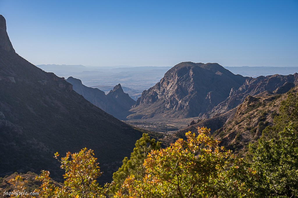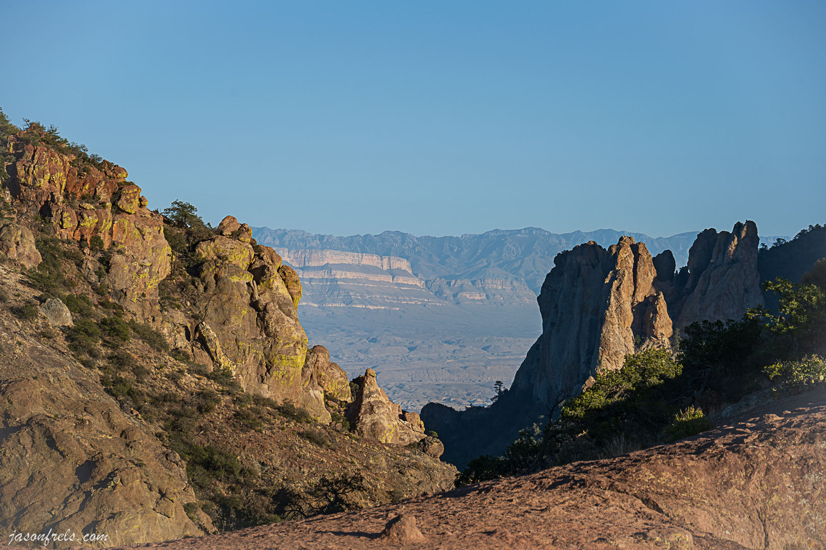 Below is a view from along the trail looking down at the Chisos Basin area where I would camp for the night. The Chisos Basin is a beautiful area set amid the mountains in the middle of the park with much sought-after campsites. It is generally a bit cooler and more pleasant that the surrounding desert that you can see in the distance. My last day at the park, I actually woke up to snow.