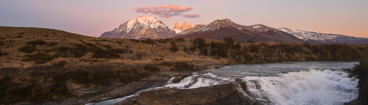 Wide shot of Cascada Rio Paine with mountains in distance (shot at 18mm)