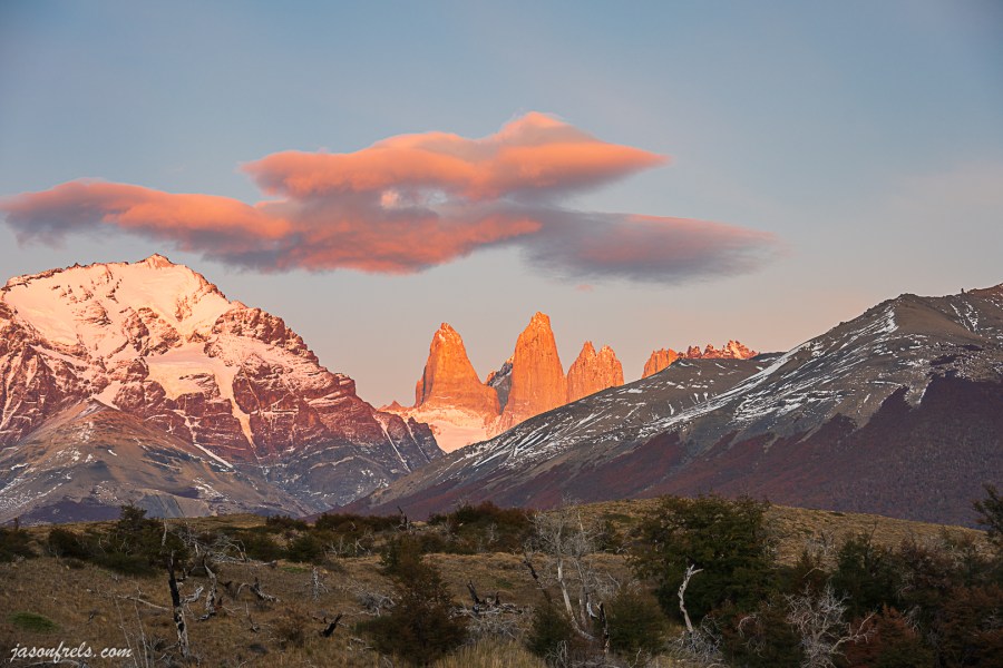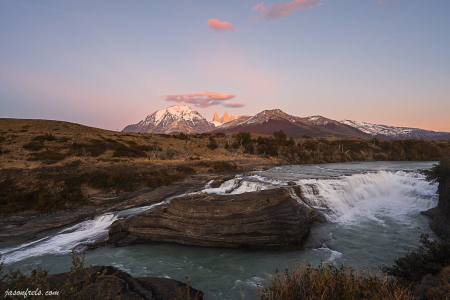 I started this day with a very cold and windy wait for sunrise at a waterfall on the Rio Paine with the mountains in the background. I had set up my tripod and then sort of just hopped around trying to be warm. At this roadside overlook, there is a gorgeous (and loud) waterfall with the mountains in the distance directly to the west. This should make for a great sunrise photo under ideal conditions. But, there were just a few clouds to pick up the predawn sunlight above the mountains and this led to a photographic problem: take a wide shot to capture the waterfall in the foreground and have a bunch of featureless sky above OR zoom in and get the mountains and distant clouds. So, I did both in the two photos below (that orange color was not enhanced by me).