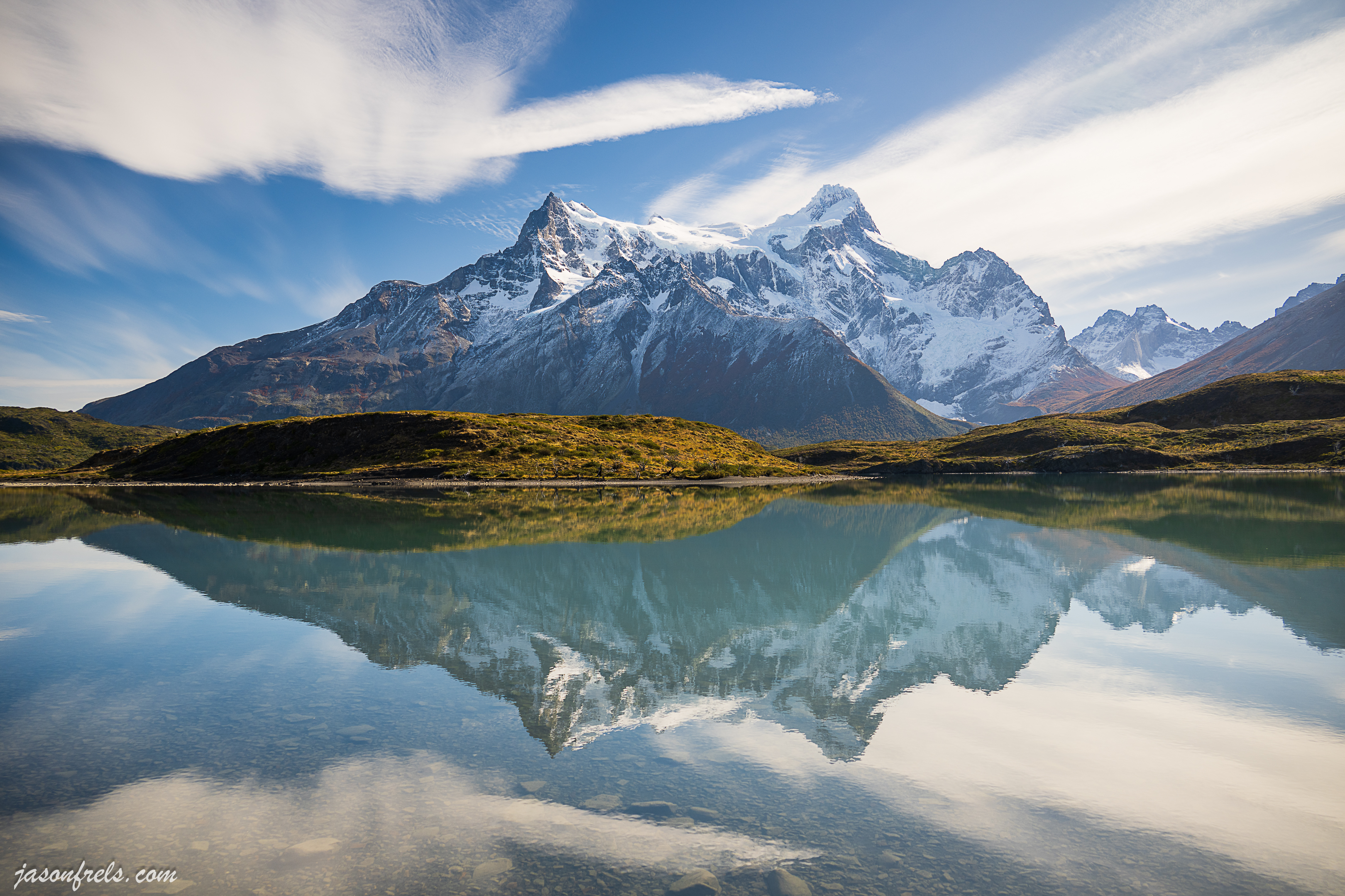 Sunrise was a bit lacking in color, but I enjoyed it all the same. We spent most of the rest of the morning watching more pumas and visiting some overlooks. The mountain slopes we covered with fall color and every day I tried to find a way to capture this. The pano below is a stitch of several photos to capture the snow-capped mountains with their reddish slopes and some lakes in the foreground. I would have liked to have walked down to the edge of the water, but that wasn’t allowed. The sun stays pretty far north this time of year, so I still got some good shadows for depth and contrast even at midday. This is probably my favorite photo of the day as I just love the autumn color on the slopes.