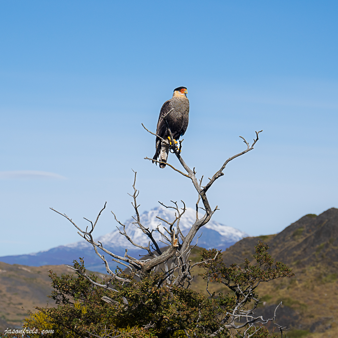 After lunch, we went for a nice hike. This hike would lead past another waterfall from the same river, then along the lake and out to an overlook. Along the way we also saw a couple of interesting birds that were content to let me photograph them. The first was a Caracara which is a relative of the falcon, shown with mountains in the distance below. There is a kind of Caracara that lives as far north as Texas though I don’t think I have ever seen one before, but I saw several in Torres del Paine. Next we happened upon a pygmy owl (Austral Pygmy Owl I think) passing the day on the branch of a dead tree. He didn’t seem to mind a dozen people shooting his photo. Both birds have a conservation status of “Least Concern” and I know what they are because our trail guide is quite familiar with the area.