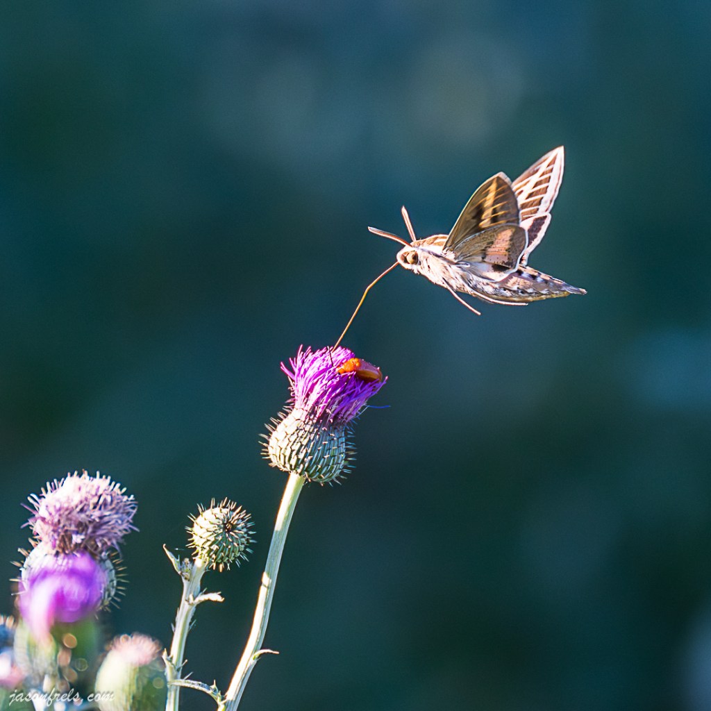 I left the green rocks behind and climbed back up the trail and decided to drive down to the other end of the park and check out the smaller waterfalls there. Along that trail, I became distracted by a moth with a long proboscis fluttering about the thistles. The sunlight was good on it and the background was dark, so I had some fun shooting photos of it. You can see in the first photo moth approaching the flower with its proboscis curled up and then it extends it to get some flowery goodness while continuing to hover. It doesn’t seem to be bothered by the other bug on the flower.
