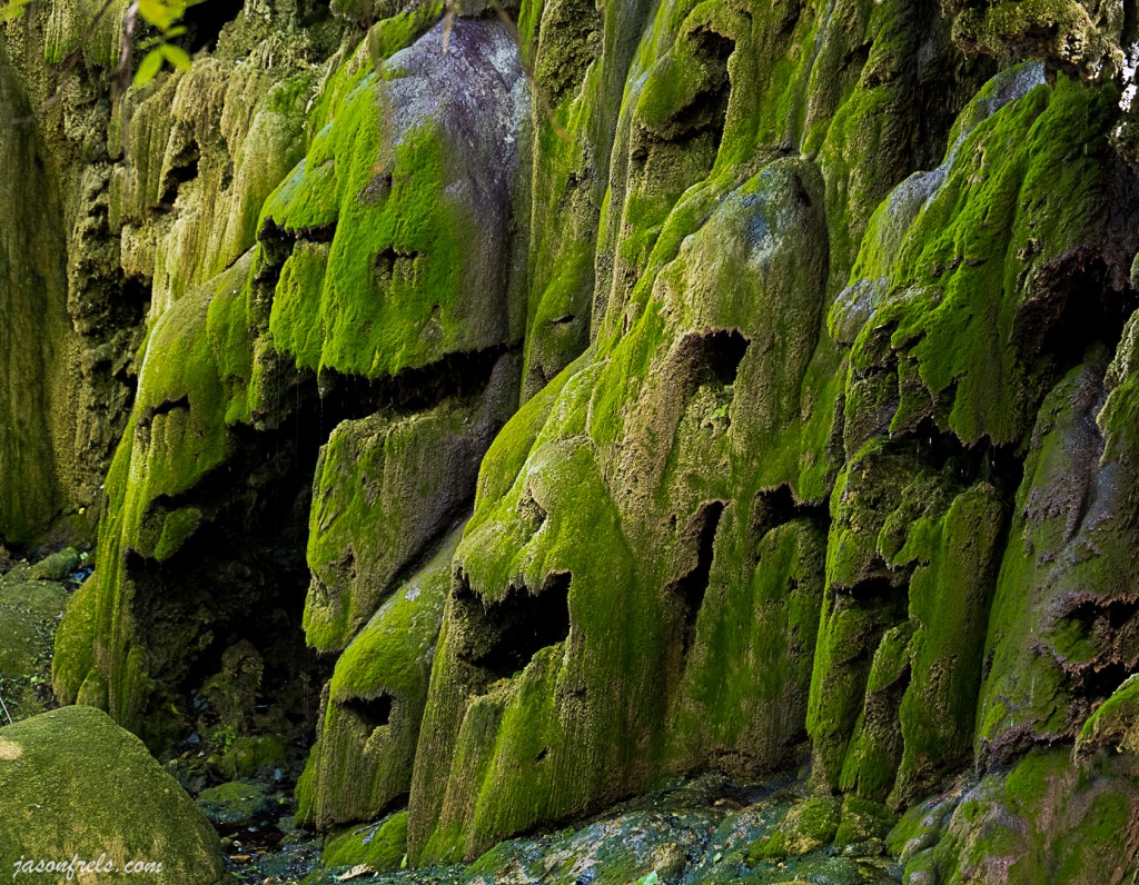 These rocks covered with algae or moss (I don’t know) might be a more interesting feature than the waterfall itself. There are certainly many interesting shapes and shadows to photograph and they are mostly shaded so the bright sunlight doesn’t overwhelm the rest of the scene. Below is a side view from up the trail a little.