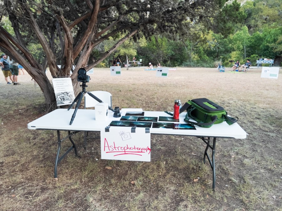I was invited by the park to come set up a table, and talk to people about astro-photography. I immediately said ‘yes’, of course, as this involved two things I love: talking about photography and Texas state parks! I didn’t really know what to bring or display when I said yes, but I ended up printing out about 10 of my favorite night sky photos on 8×10 paper and I brought my camera equipment to talk about. They set me up with a table among the others that were there. There were people talking about telescopes, plants and wildlife, members of some other parks in this region, games, etc. Surprisingly enough, a lot of people stopped by and asked me about my pictures and quite a few wanted to know about camera settings. Below is my little table (I didn’t create the sign).