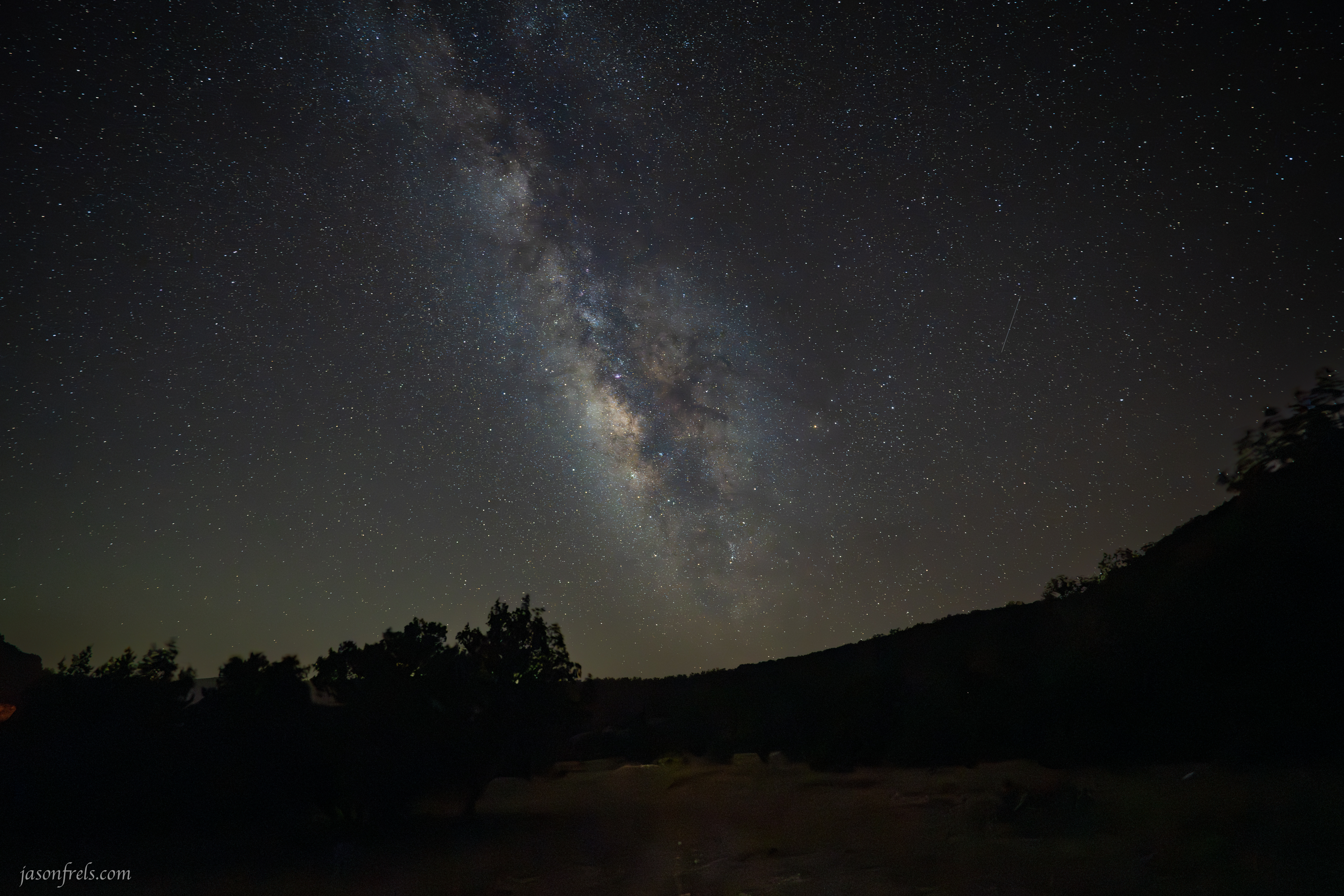 Anyway, on to the the night sky. The San Antonio astronomy society set up a viewing area on a hillside near a place called the Murphy House. There was a nice view of the night sky and many people were there with chairs looking at the Milky Way and watching for meteors. There were also many telescopes set up. I hung out and shot a few photos from this point, but I didn’t think there was really much of a landscape to go along with the sky and I didn’t want to shine my light around with so many people trying to see the stars. Below is my shot. You can see that the Milky Way is prominent in the sky with just a little light pollution on the distant horizon. I also saw a few meteors but I can’t tell if that streak in the photo is a meteor or satellite.