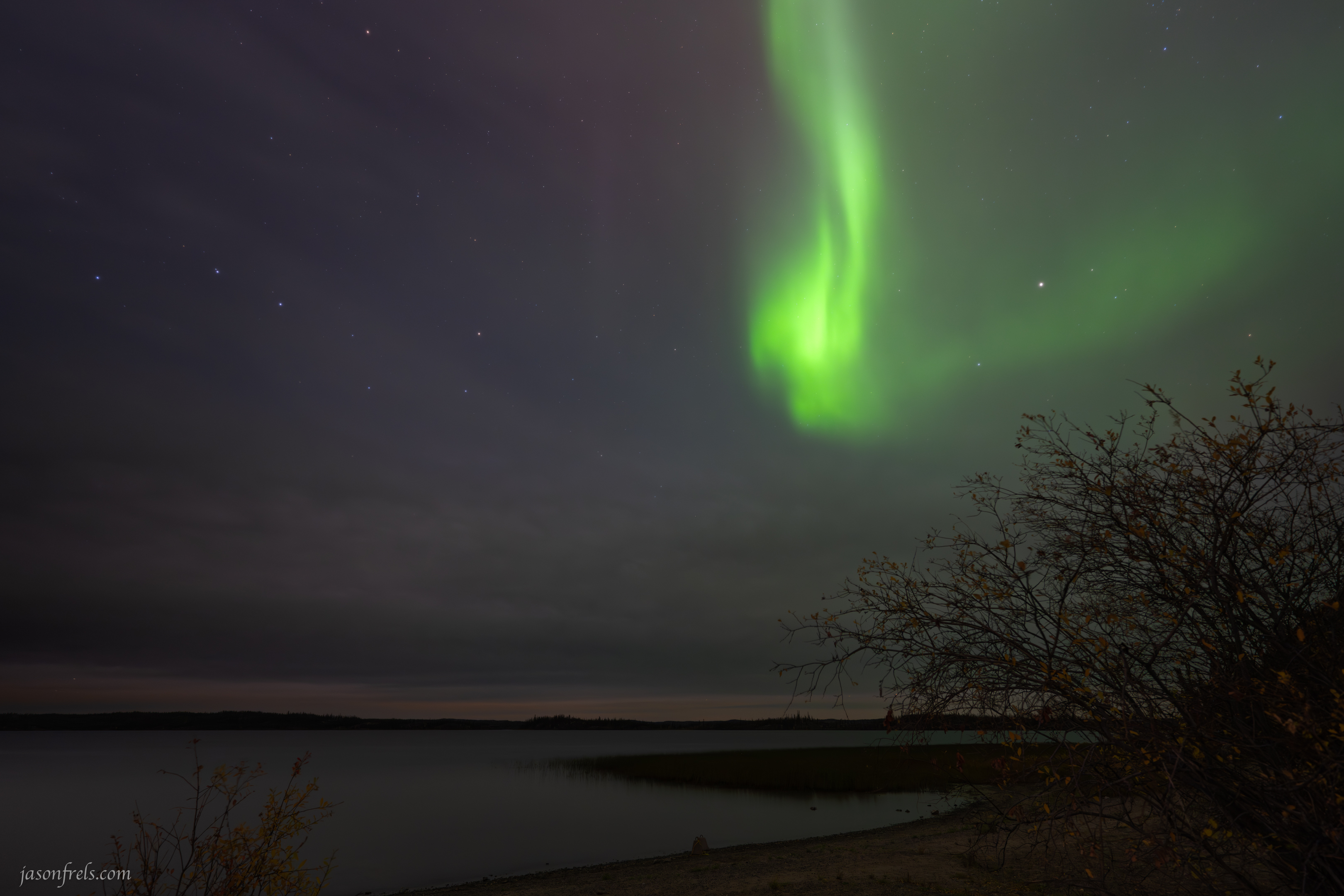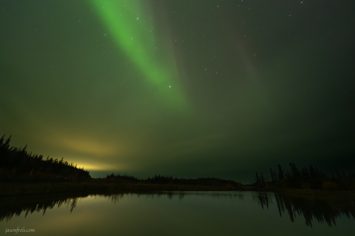 At about 10:00PM on Monday evening we went down and were picked up by the tour. It turns out that most of the tour business in Yellowknife is from visitors from East Asian countries as we were the only two westerners on the bus. I guess this makes sense as I doubt there are many people that want to go to northern Russia to see the aurora. Another North American option is Fairbanks Alaska, but I read that Yellowknife gave you better weather for viewing the northern lights this time of year. Anyway, the bus took us out along the road to the territorial parks I had visited during the day to a variety of stops. Most of these stops featured lakes, which is nice for the reflection potential. Below is one of the early shots I took with a ribbon of green light across the sky.