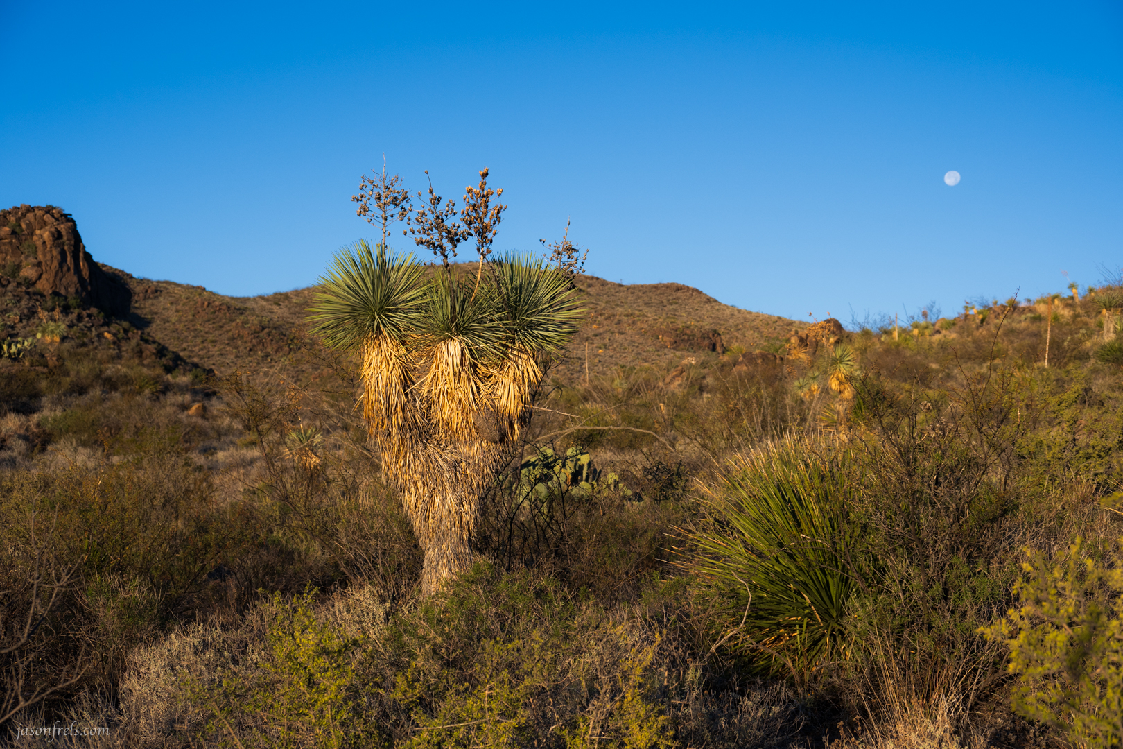 As the sun made it through the clouds and over the distant mountains, it lit up the area around the campsite and I messed around taking a few photos before packing up and heading for some hiking trails. You can see the morning sunlight off of a Sotol, Yucca, and the full moon in the photos below. There was a rocky outcropping near my campsite and I climbed around looking for things to photograph for an hour or so. These are a couple of the photos that I thought turned out nicely.