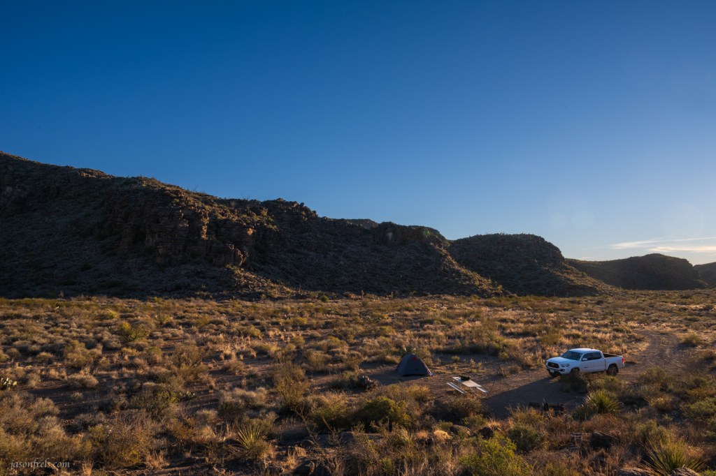 Getting to the campsite was a bit of an adventure. After topping off my gasoline tank in Presidio and driving for an hour on dirt roads to get the visitor center in the center of the park, I then had to take a road that transitioned from maintained dirt road, leading to a very rough and rocky 4WD road. This part of the road went over loose rocks, down through dry creek beds, and over hills. I don’t think I ever got out first gear once on this road and it took me about an hour to get out to my campsite. A normal road-going car would have no chance of getting to this campsite.