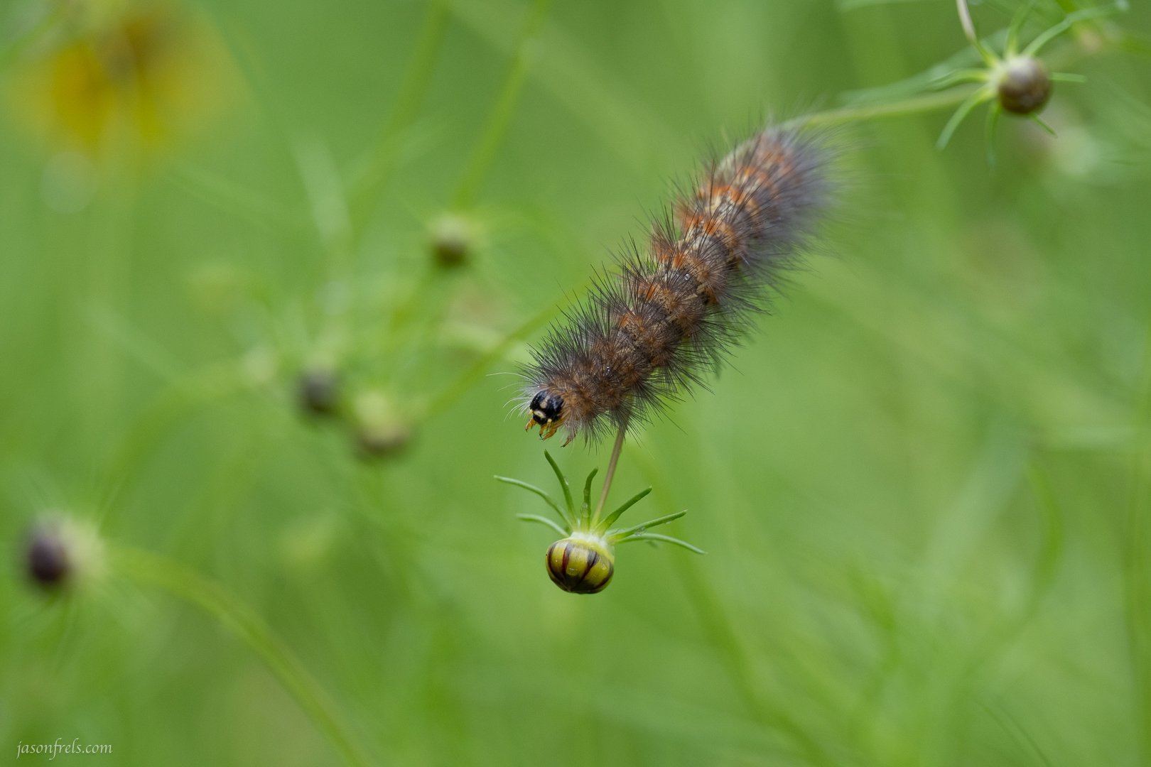 There were also fuzzy looking caterpillars everywhere, on the plants and on the trail. It took effort not to accidentally step on them. I have always thought of these as wooly caterpillars and I think that is basically what they are called, but there are hundreds of different varieties of them across North America. They look soft and fuzzy, but the fuzz is actually spiky to deter birds and other animals from eating them. If you touch one, it is not venomous but it will likely irritate your skin. In the spring they emerge, fatten themselves up, and eventually become moths and central Texas seems to be having a bumper crop of them this year. In one of the images below you can see one heading for the flower tip to eat the green petals, which they seem to prefer. And in the next image you can see the moth that they eventually become.