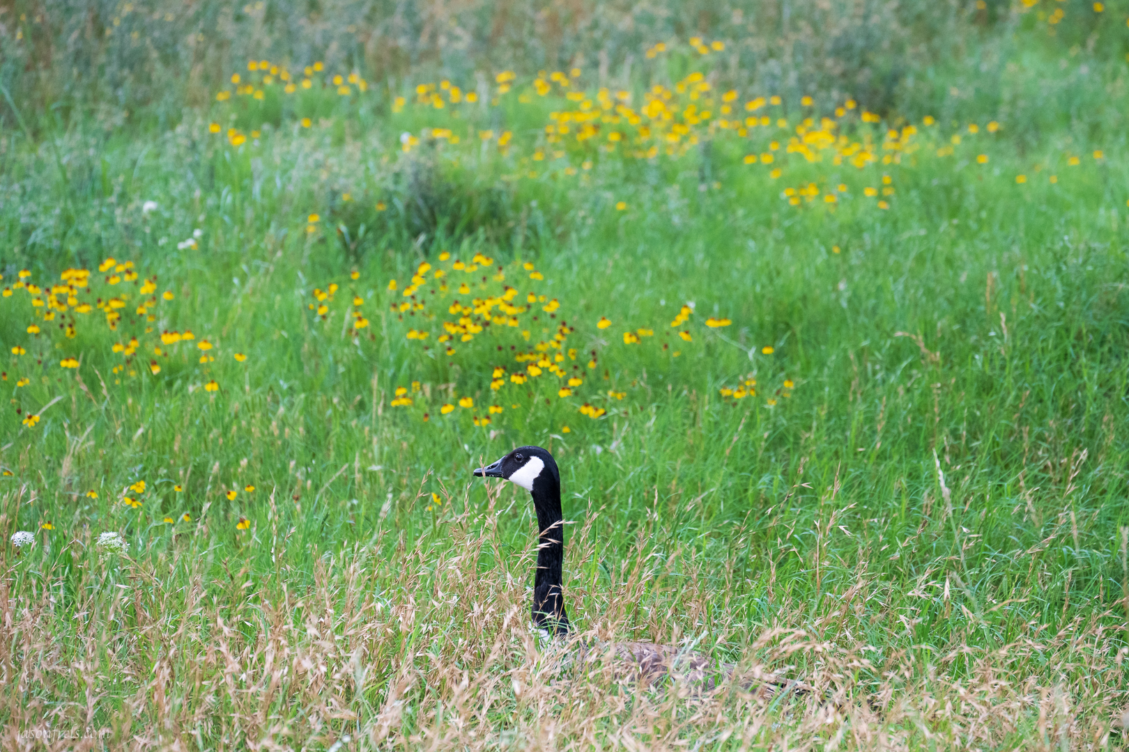 My hiking continued without deer, but at least I had the wildflowers. On the way out I saw some geese moving through the tall weeds feasting on the grass seeds. Their dark necks and two-color heads stood out but their light brown bodies blend in with the grasses and I thought it made for a funny image. Shot from my vehicle window.