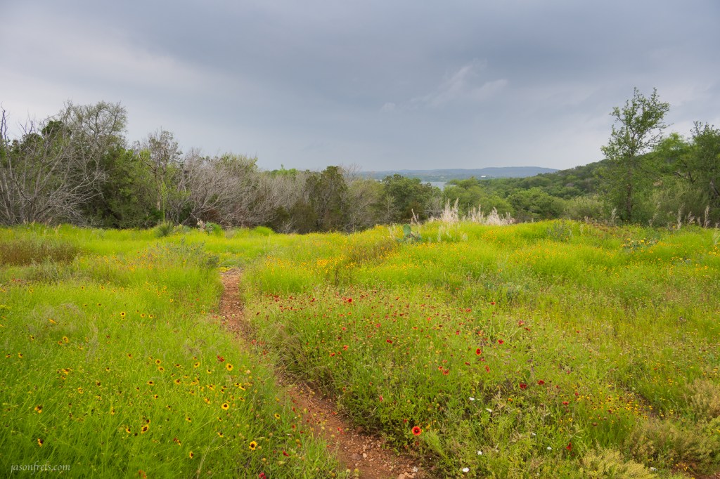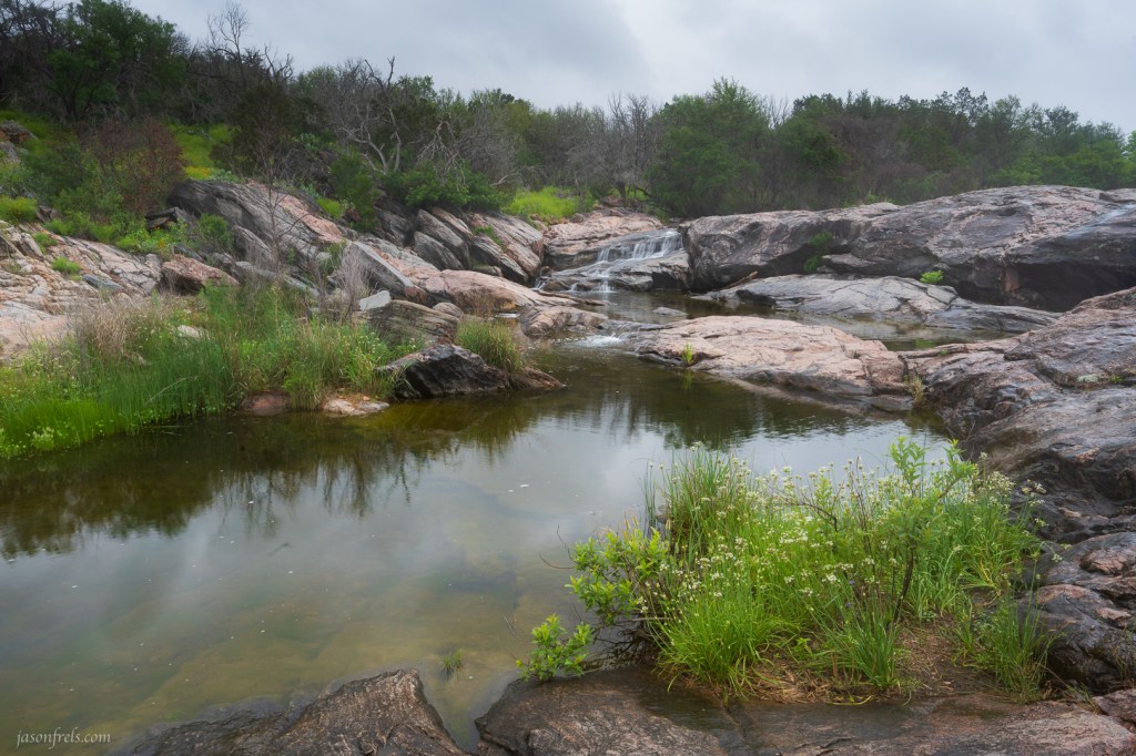 We’ve had a rainy week and it occurred to me that the little waterfall at Inks Lake State Park might be flowing well. This waterfall is on spring creek, named such because it generally only has much water in it in the spring. Also, it was a very cloudy Saturday, which I thought might make for good conditions to shoot the waterfall as the light would be softer. I have shot the waterfall on a clear sunny day, and the strong light makes for too sharp a contrast between the brightly lit rocks and the shadows. So I drove through the rain to Inks Lake State Park and was prepared to hike in the rain. When I got there the rain had been reduced to a mist and the park was quite full of weekend visitors. I had hoped the rain would keep people in and I would be able to shoot the waterfall without people all over it.