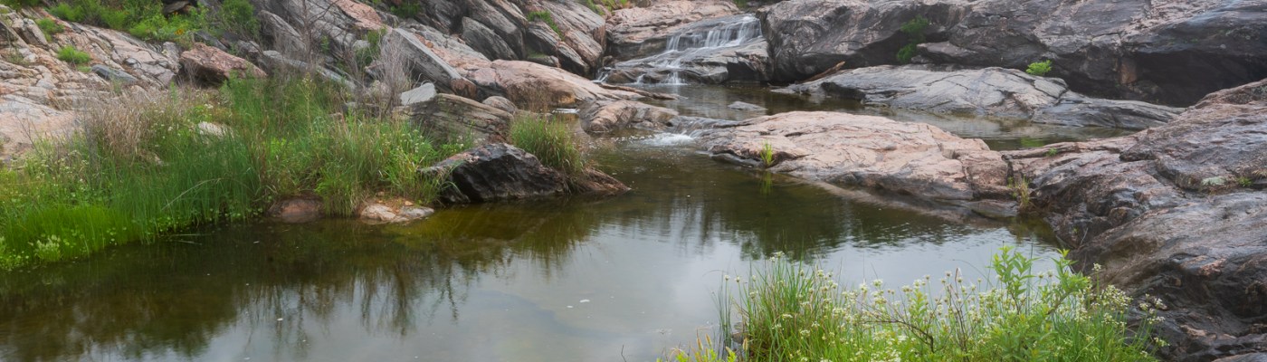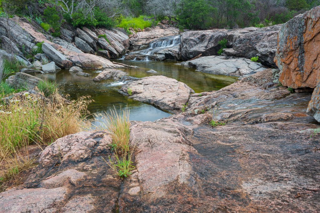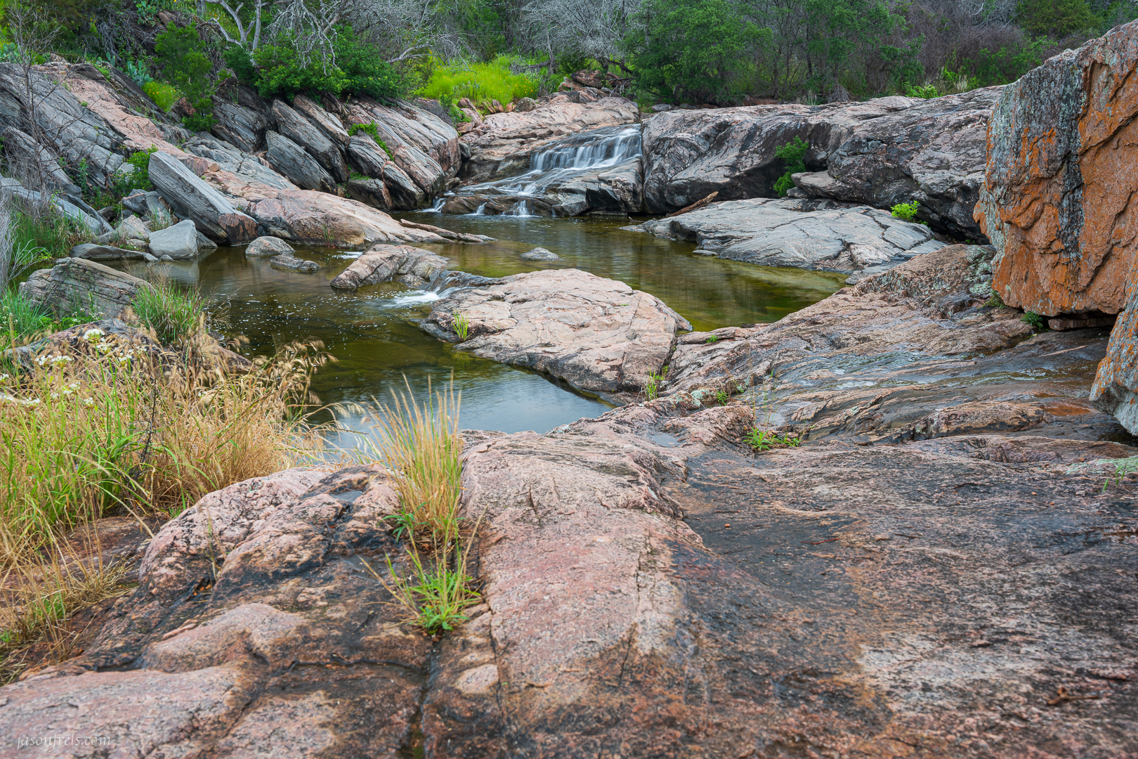 As I got closer, the rocks got more and more slippery. I knew that with nothing to hold on to, there was no way I was going to make it out onto the rocks directly in front of the waterfall without slipping and falling. So, I made do with what I could get from farther back. In the image below you can see the slippery rocks at the base of the small waterfall. It may not look like it in the photo, but the granite was coated with water and very slick. The creek bottom is coated with slippery green algae and I knew better than to try to wade out into that. I would have liked to set up on the rock directly opposite the waterfall in the distance, but I didn’t chance it. I also tried my best to shoot without the flat gray sky in the image.