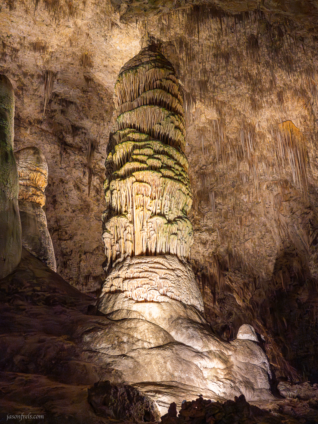 It is difficult to shoot photos in a dimly lit cave, but I did bring my camera and took some decent photos. There are some lights in the caverns shining on features but the lights are very dim and create very dark shadow areas. I took a few photos with my phone but they generally aren’t very good as you can see artifacts from the computational correction. I mainly used my camera with a 35mm f/1.8 lens, which is the fastest lens I have. The only real trick to it is to step up the ISO until I was shooting at least 1/50s shutter speed, which is fast enough to get sharp images with a 35mm lens. The column above was shot at ISO3200, which provided a decent photo but with some noise. I used the noise reduction in Lightroom to clean it up a bit which works really well as long as you don’t overdo it. I also boosted the shadows as they were almost completely dark with the spotlight on the feature.