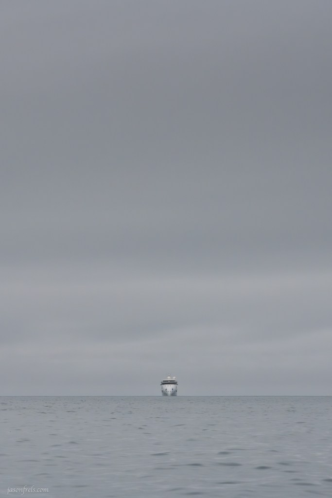 Back to the ship. I took the vertical below as there was just so much featureless gray sky above the ship that I thought the negative space would really emphasize the little ship on the sea. I promise that the image below is a full color image; it was just that gray on this day.