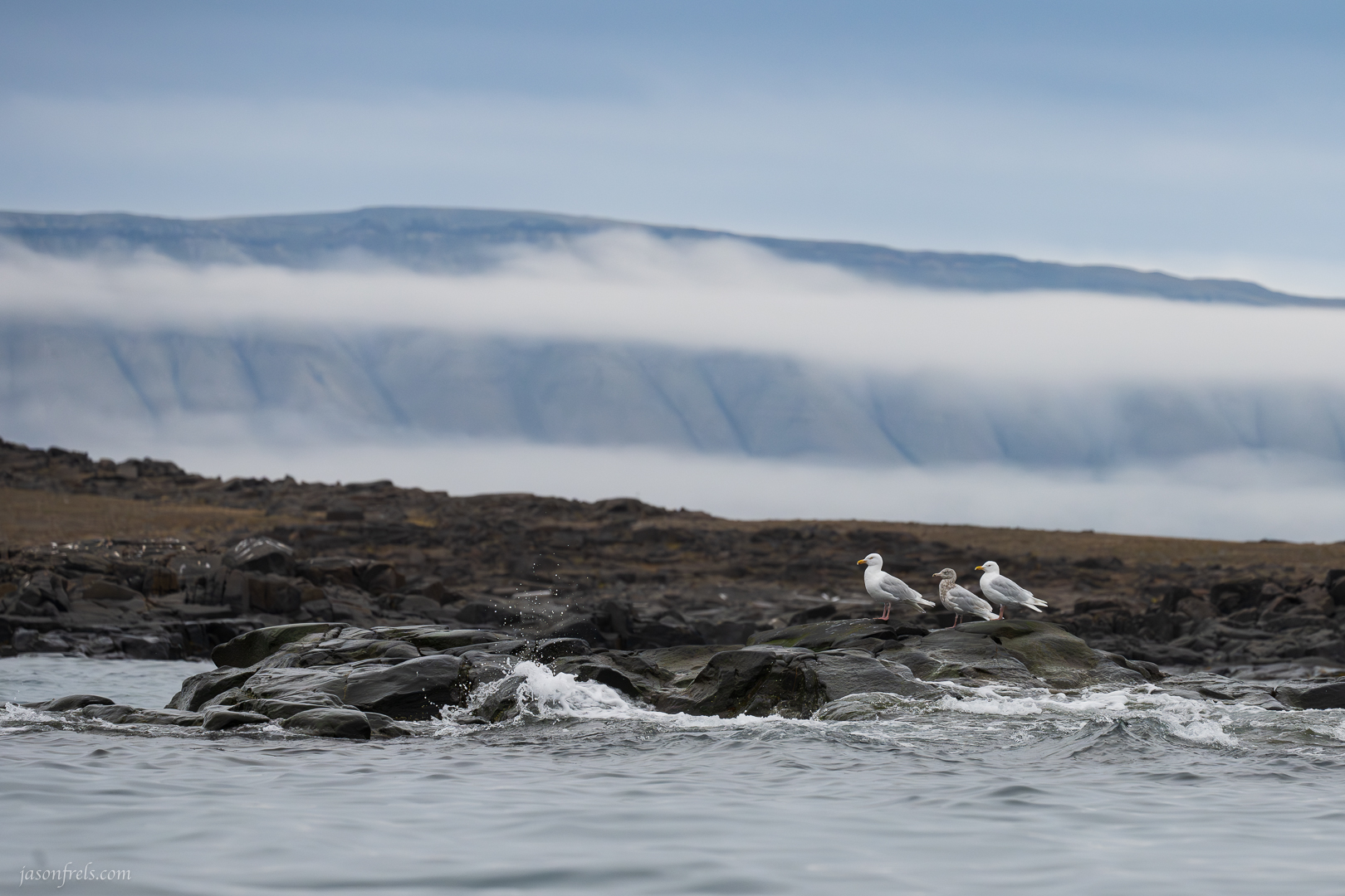 We eventually got to the carcass and waited to see if a bear would show up. The sea birds were already onsite and waiting to see what would happen. The photo below with the sea birds against the shrouded hills in the distance was begging me to take it. I tried to wait for waves to crash on the rocks, but the sea was relatively calm on this morning.