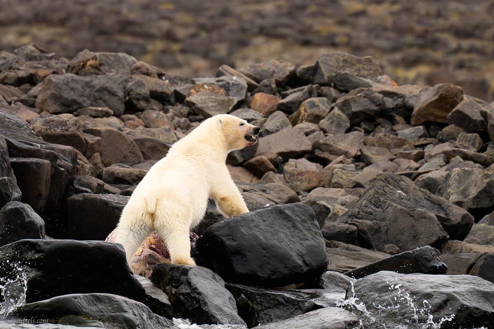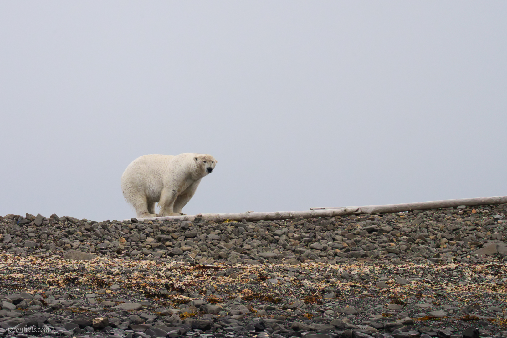 The polar bear eventually approached the carcass and carefully began going after it. I have a lot of photos in which the bear is eating the animal but they are all bear butt photos, so I didn’t include them. The bear would attack the carcass for a minute and then pop its head up, look around and sniff the air for a minute. I think it was worried that the other bear would show up.
